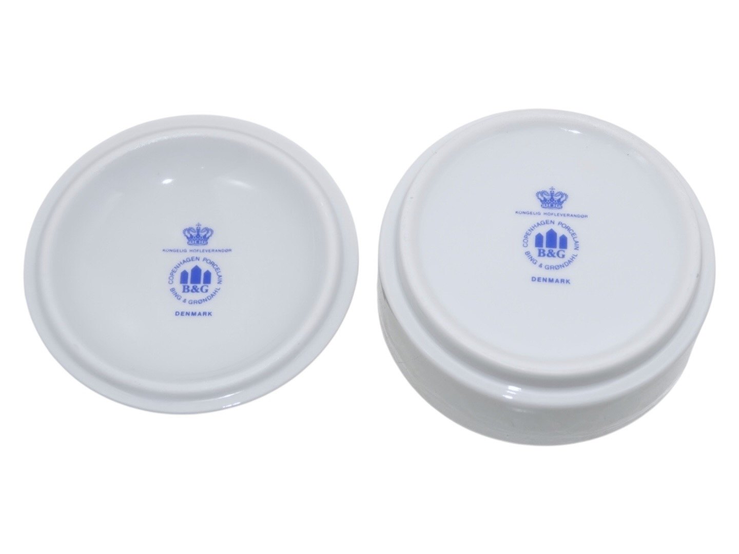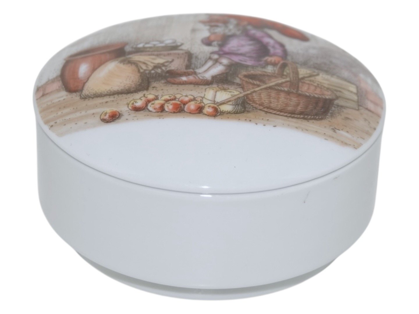 Bing & Grøndahl, rund bonbonniere med julenisse der skal i gang med at bage æbleskiver.Af fabriksmærket kan det udledes, at denne er produceret mellem 1970 og 1983.