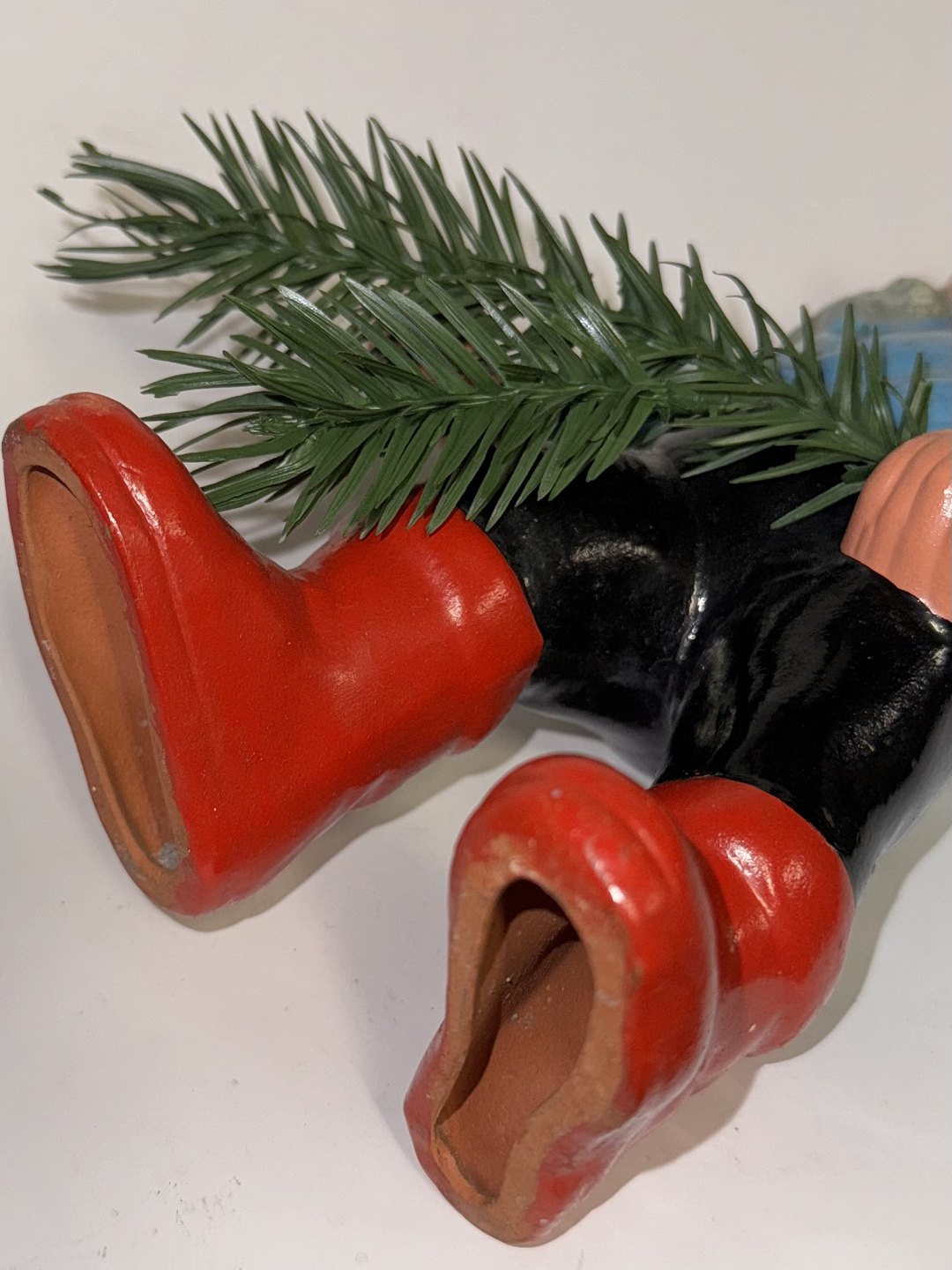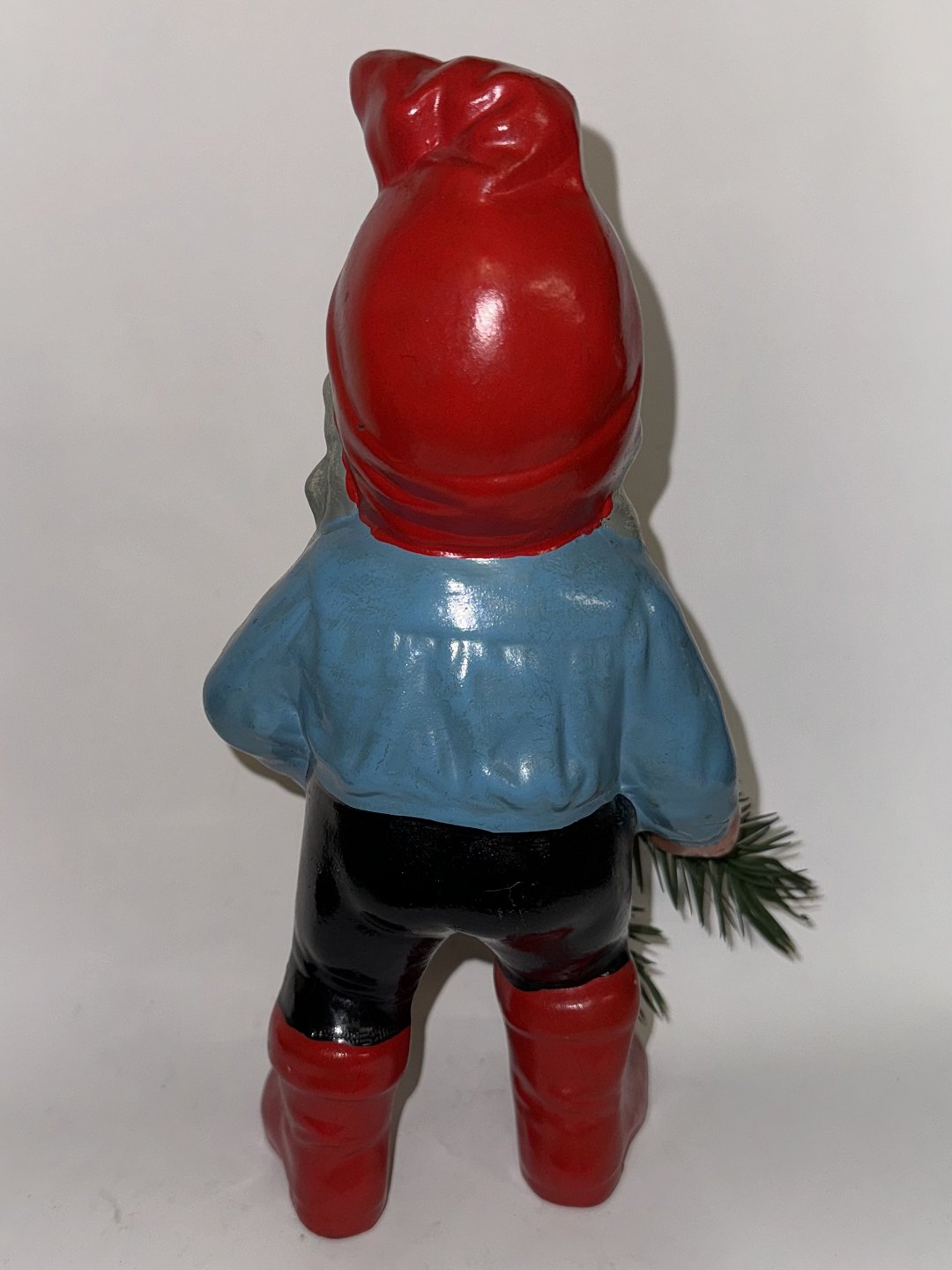 Nisse i keramik med Grandgren i hånden. Fint bemalet. I god stand. Ingen skader eller reparationer. H. 26,5 cm
