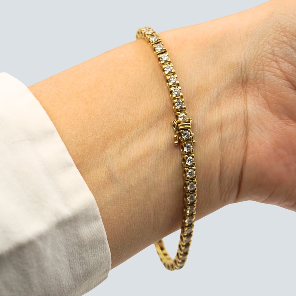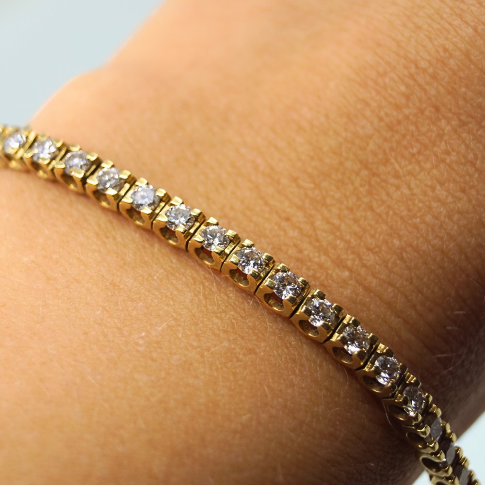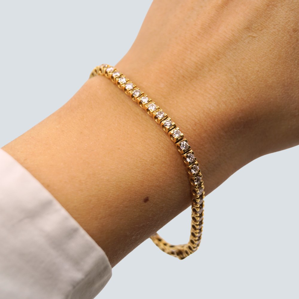 Tennisarmbånd af 18 kt. guld prydet med 50 brillanter. Brillanter i alt ca. 3,50 ct. Top Wesselton - SI. Monteret med kasselås samt to sikkerhedslåse. Diamantarmbånd.l. 18 cm. B. 3 mm.