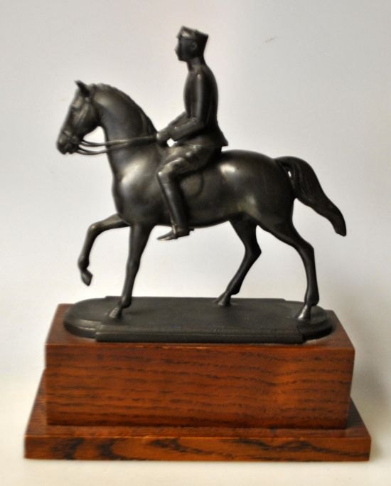 Galster, Johan G. C. (1910 - 1997) Danmark: Rytterfigur af Kong Chr. X til hest. Bronzepatineret metal. På plint af poleret egetræ. Signeret: Galster 1941. L.: 19 cm. H.: 22 cm..Fremstillet hos Madsen & T. Baagøes Elektroplet og Nysølvvarefabrik i 1941.