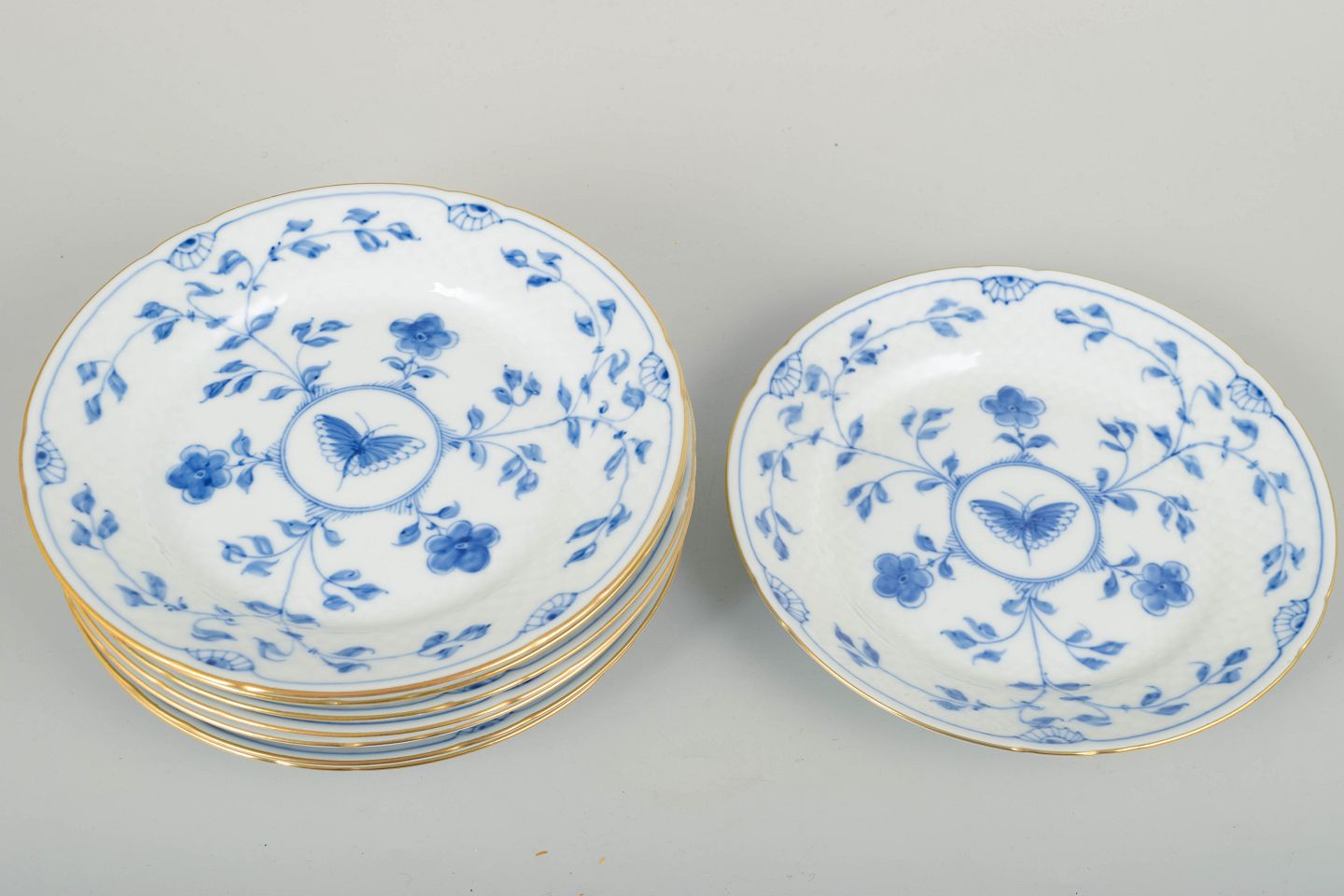 Bing & Grøndahl sommerfuglSmukt sæt på otte desserttallerkener med håndmalet sommerfuglemotiv og blå blomsterornamentik, afsluttet med en elegant guldkant.