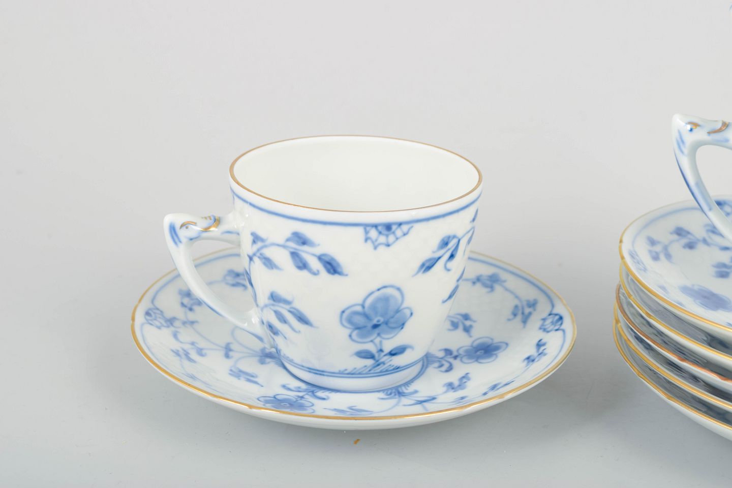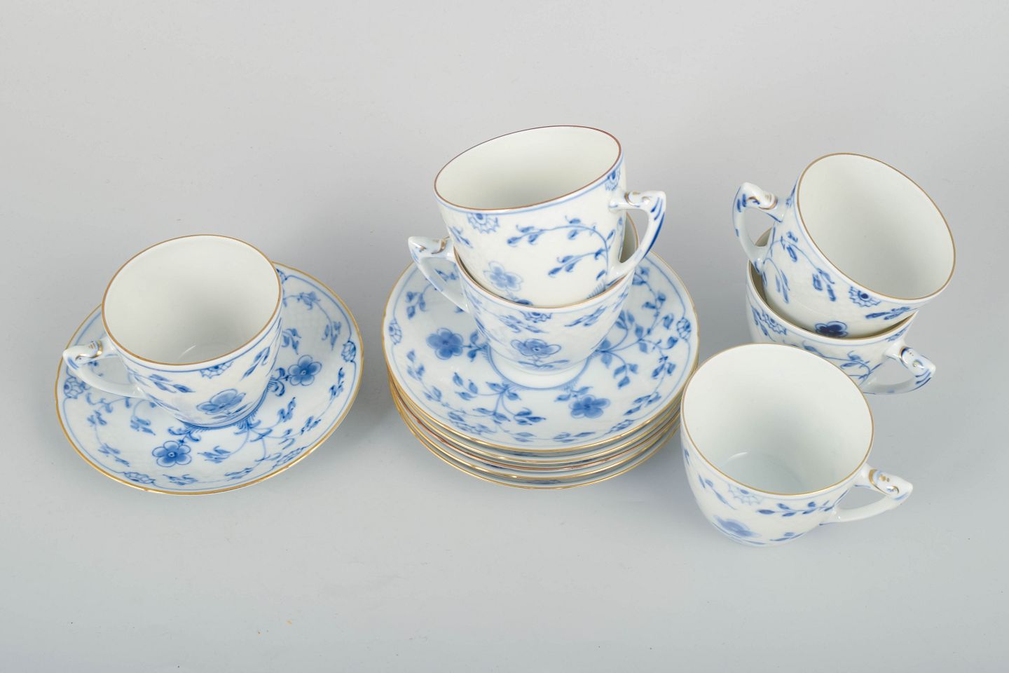 Bing & Grøndahl, sæt med seks kaffekopper med underkopper i det klassiske håndmalede dekormønster Kipling med gulddekor.Kopperne viser den karakteristiske blå flora på hvid porcelænsgrund.