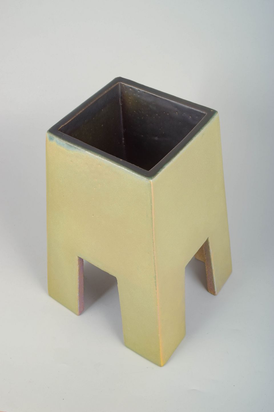 Skulpturel og geometrisk formet vase i stentøj, udført med en mat, håndglaseret overflade i lyse, afdæmpede toner. Et karakteristisk eksempel på Mobach-værkstedets modernistiske tilgang, selv når værkerne ikke er signeret.