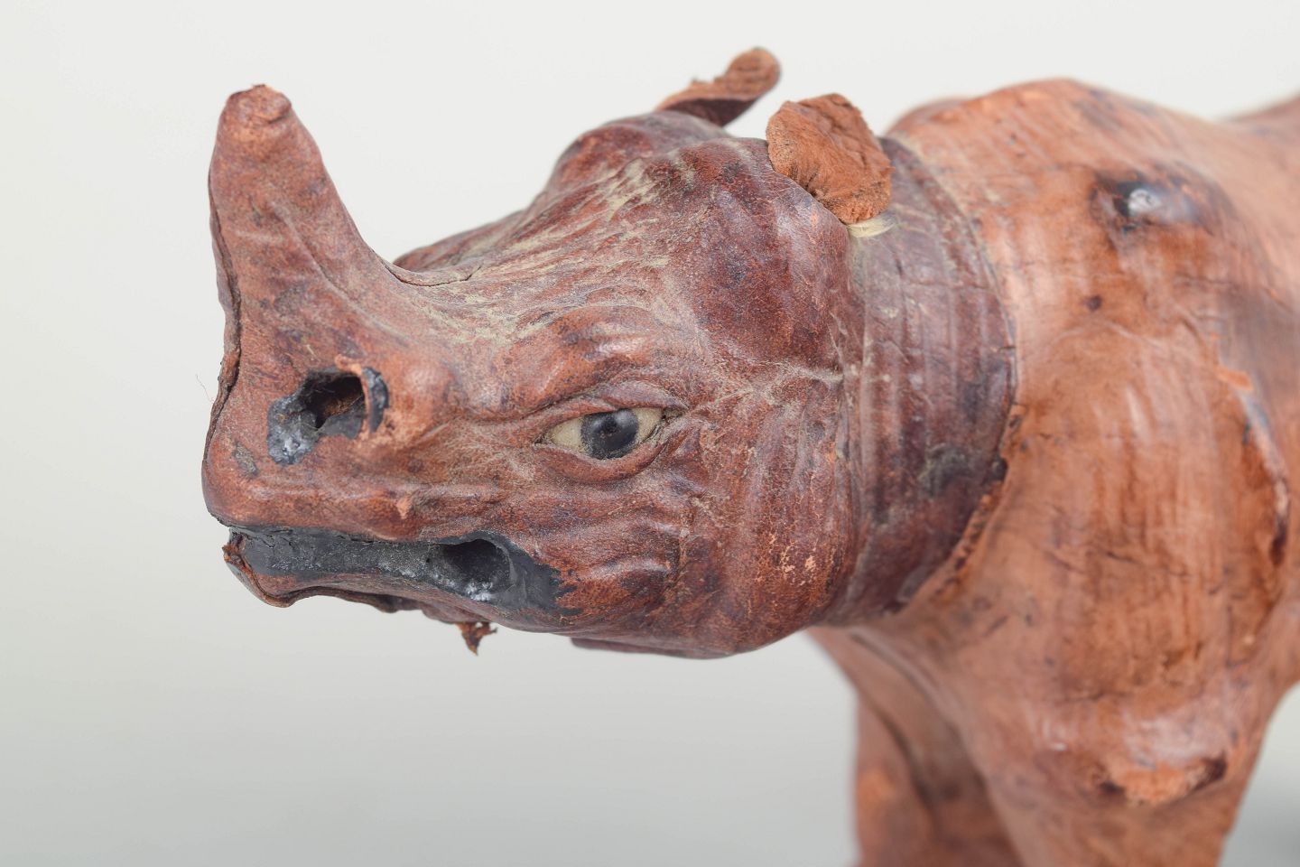 Omersa for Liberty & Co., London – Lille lædernæsehornsfigur, midt 1900-talletHåndlavet næsehornsfigur udført i formet og syet læder, muligvis solgt gennem Liberty & Co., London. Figuren har fint modellerede detaljer, udskårne øjne og en varm patineret overflade.