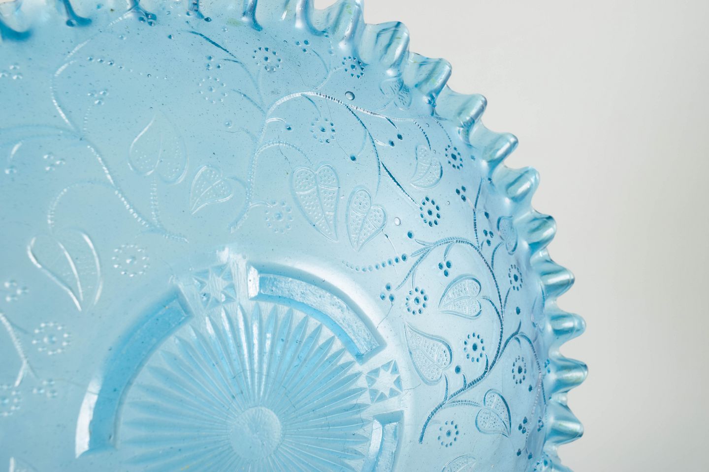 Glasfad, Skandinavien, tidlig 1900-tallet.Dekorativt glasfad i lyseblå presset glas med bølget kant og indpresset blomster- og rankemønster. Et typisk eksempel på nordisk glasproduktion fra perioden, hvor funktionelle hverdagsgenstande blev udformet med markant ornamental finesse.