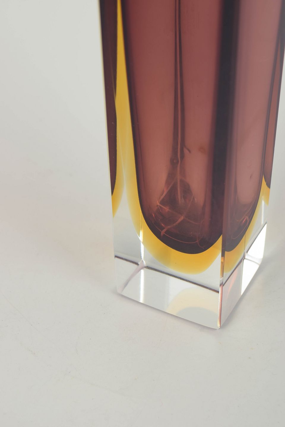 Murano Vase, 1960´erne.Rektangulær Murano-vase i lagdelt sommerso-glas med klar ydre krop, dyb ametystfarvet indre kerne og varme gule overgange. Et elegant eksempel på 1960’ernes italienske glasdesign, kendetegnet ved skarpe linjer og optiske farvespil.
