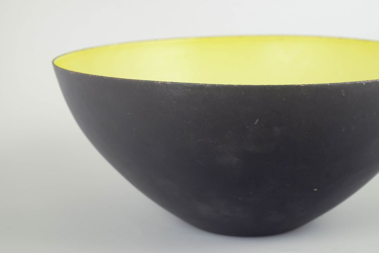 Krenit skål, 1960’erne.Klassisk dansk designskål i sortlakeret metal med emaljeret inderside i en sjælden gul farve. Den ikoniske halvkugleform giver et skarpt, minimalistisk udtryk, karakteristisk for Krenit-seriens tidløse design.