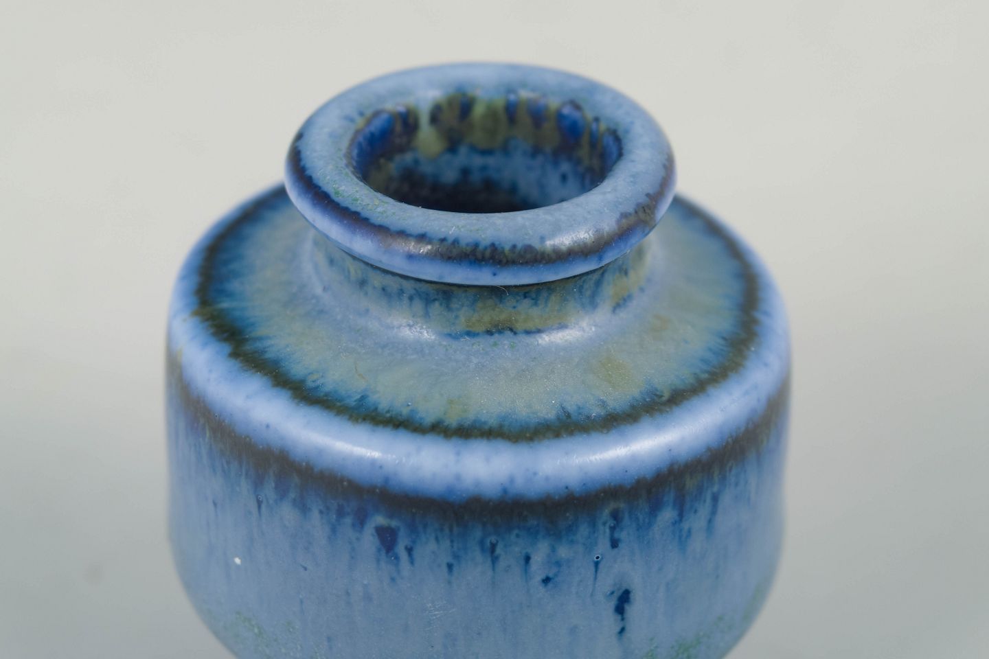 Lille miniaturevase i glaseret stentøj med kompakt cylindrisk form og nuanceret blågrøn løbende glasur.
