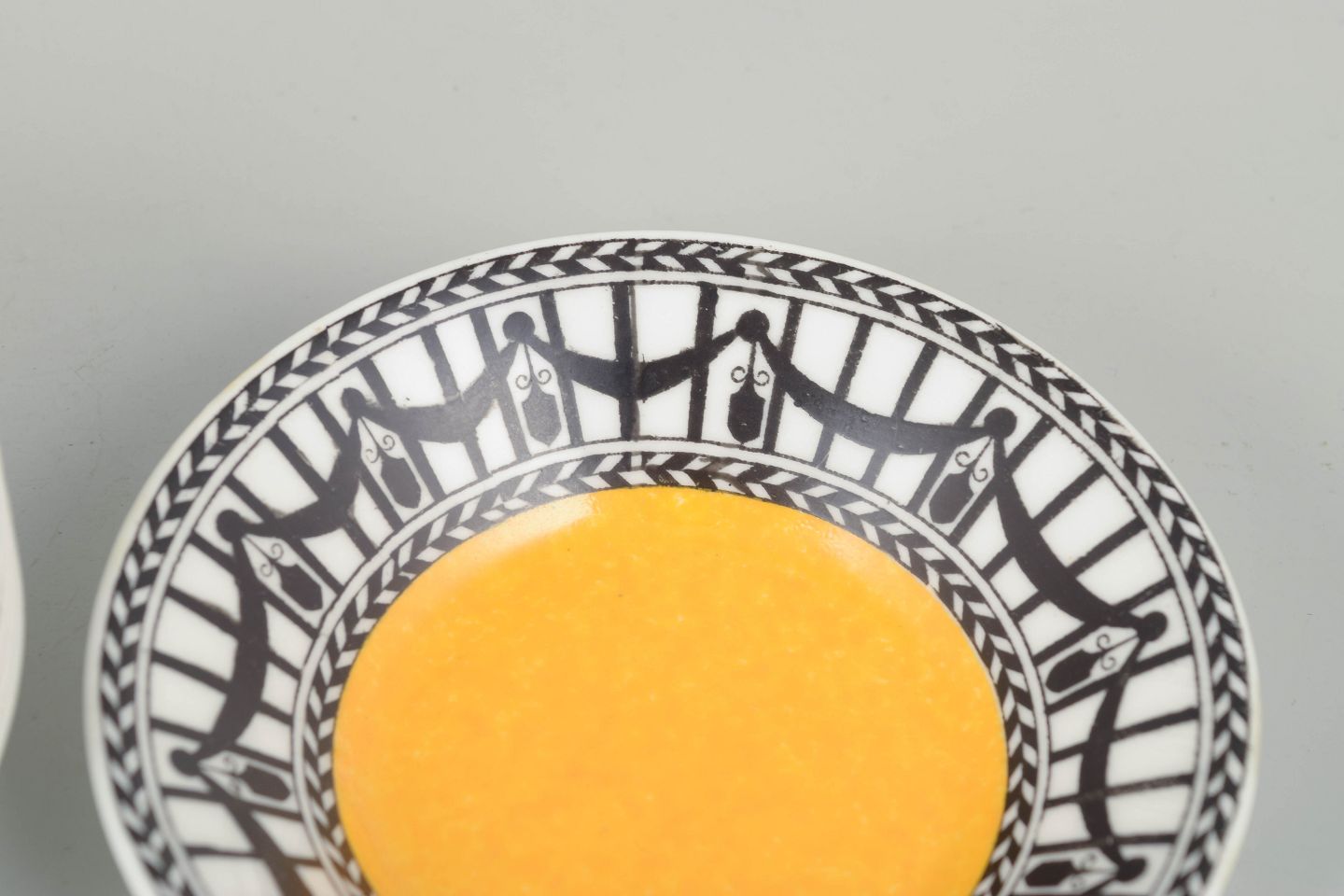 Fem små faienceskåle med gul midte og dekorativ kant i sort-hvidt geometrisk mønster, typisk for tidens ornamentik.