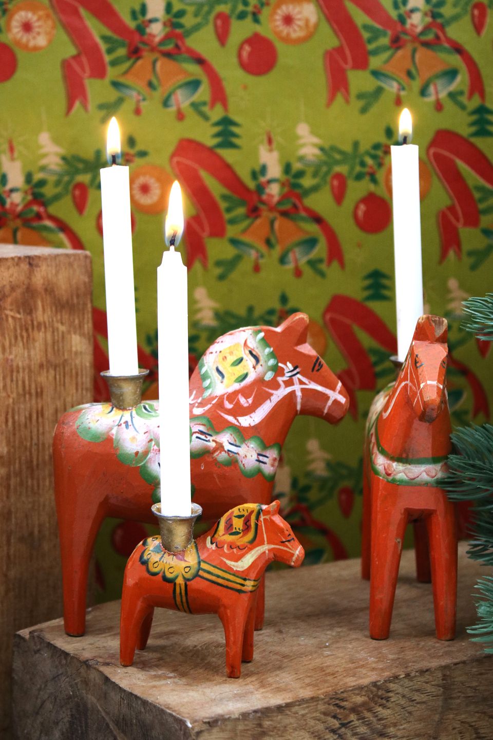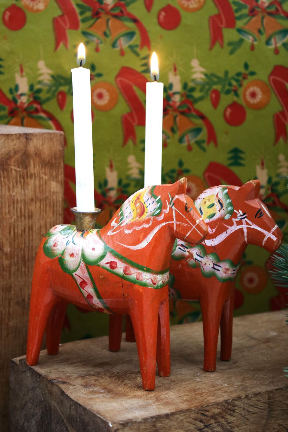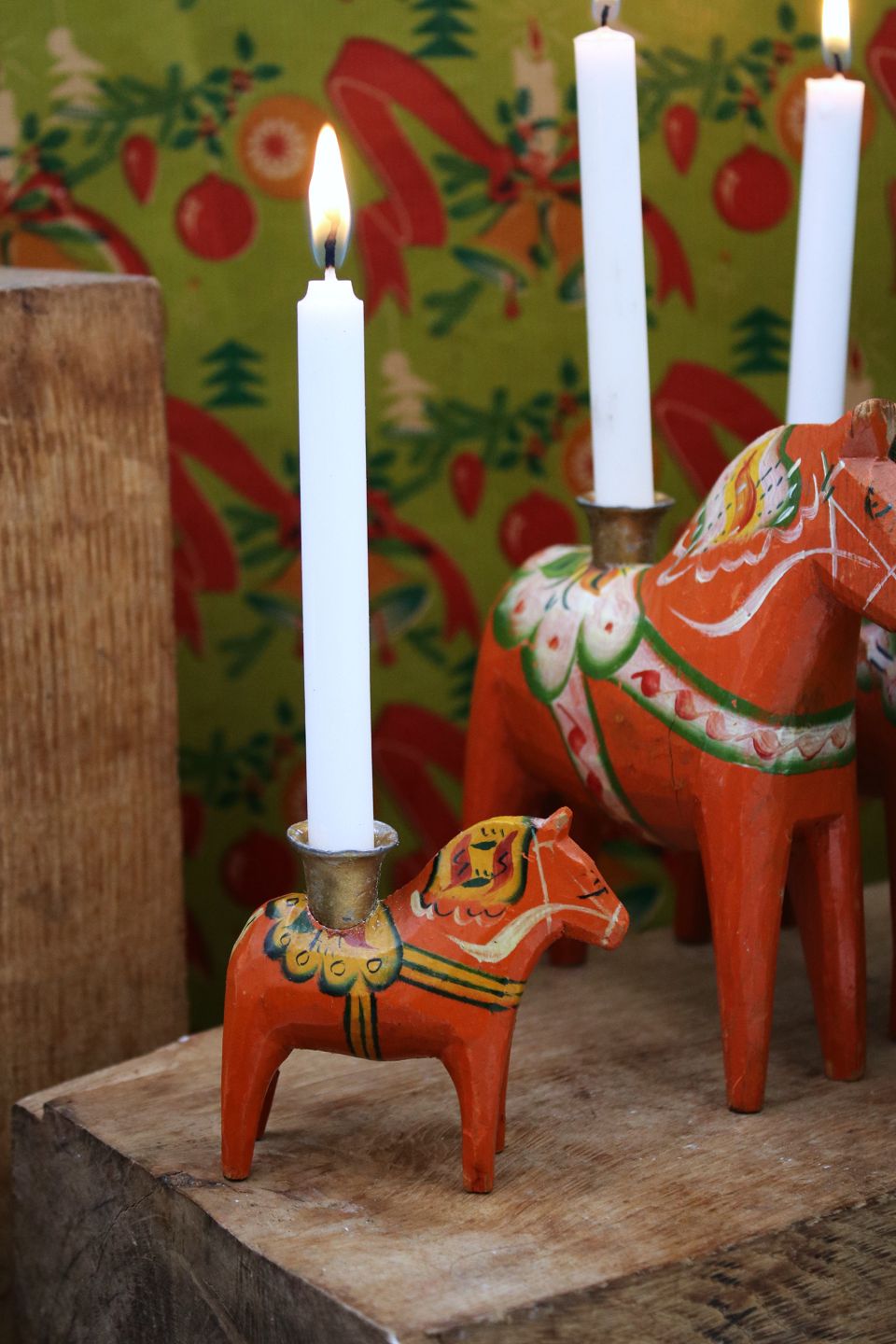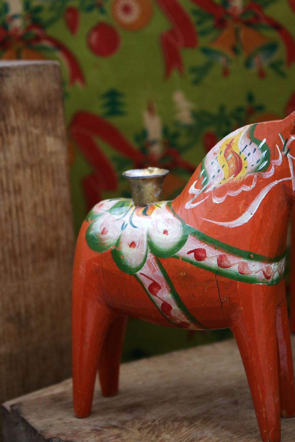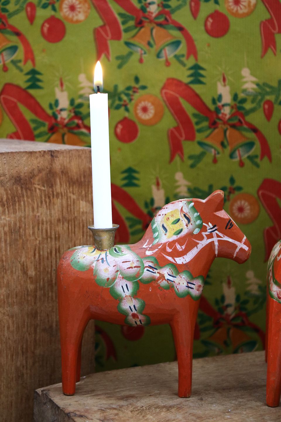 Gammel svensk Dalarhest julelysestagemed plads til et lille julestearinlys på ryggen.