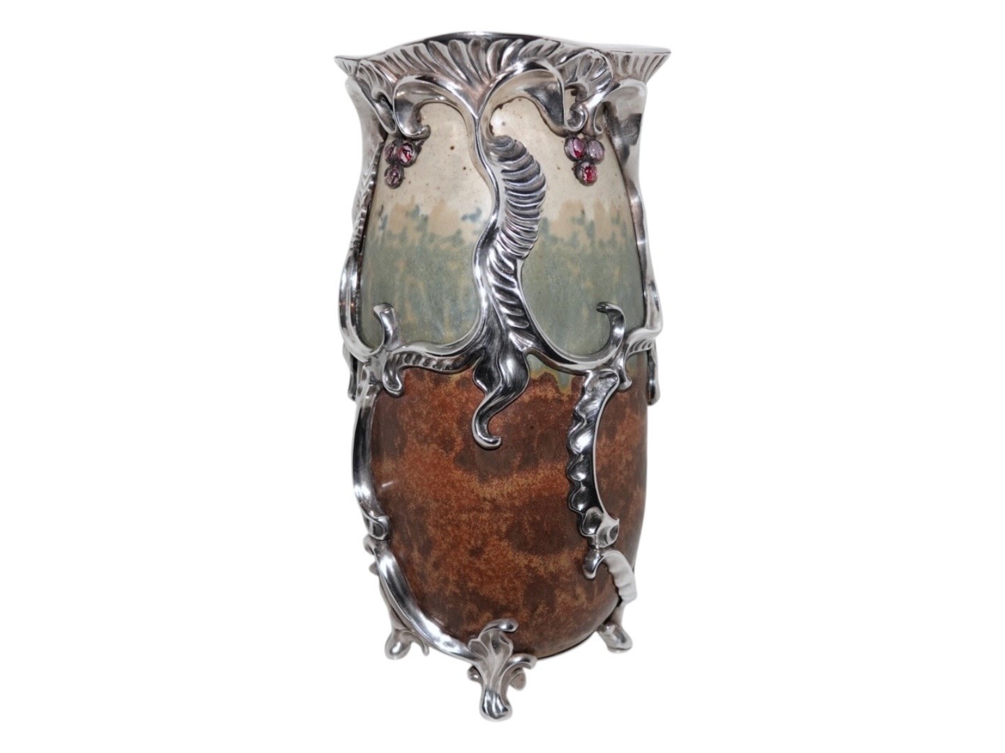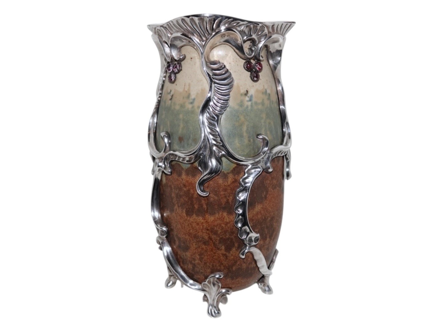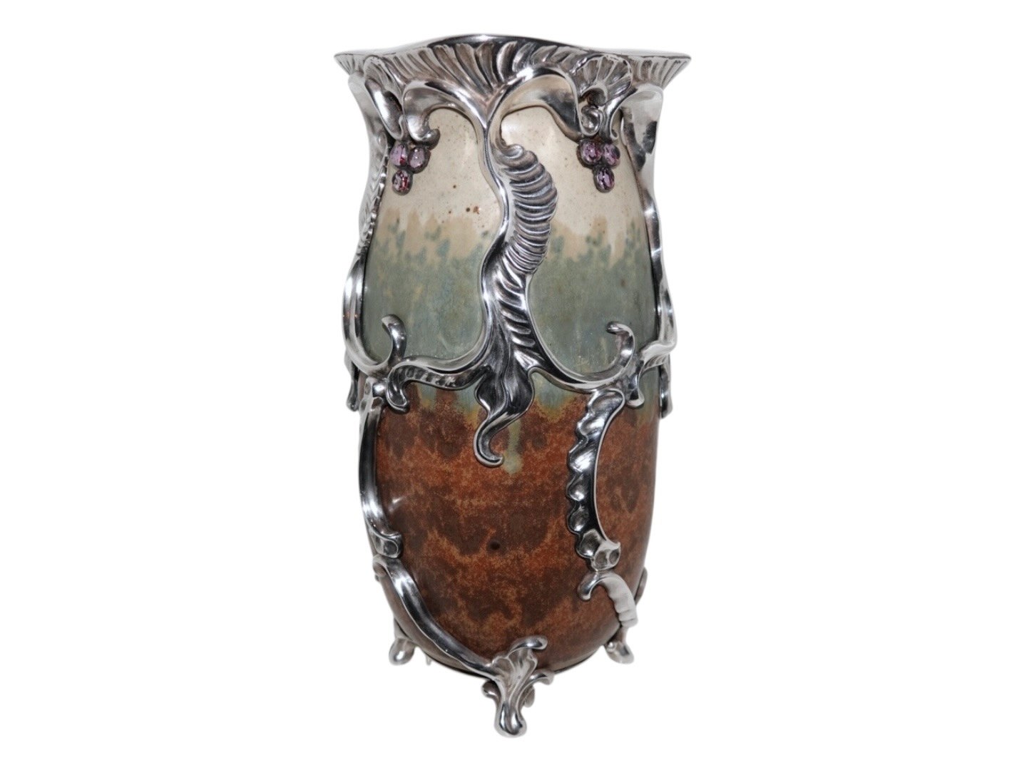 Royal Copenhagen keramik, stor og unik Patrick Nordstrøm vase med ekstravagant og kraftig sølvmontering og ametyster.