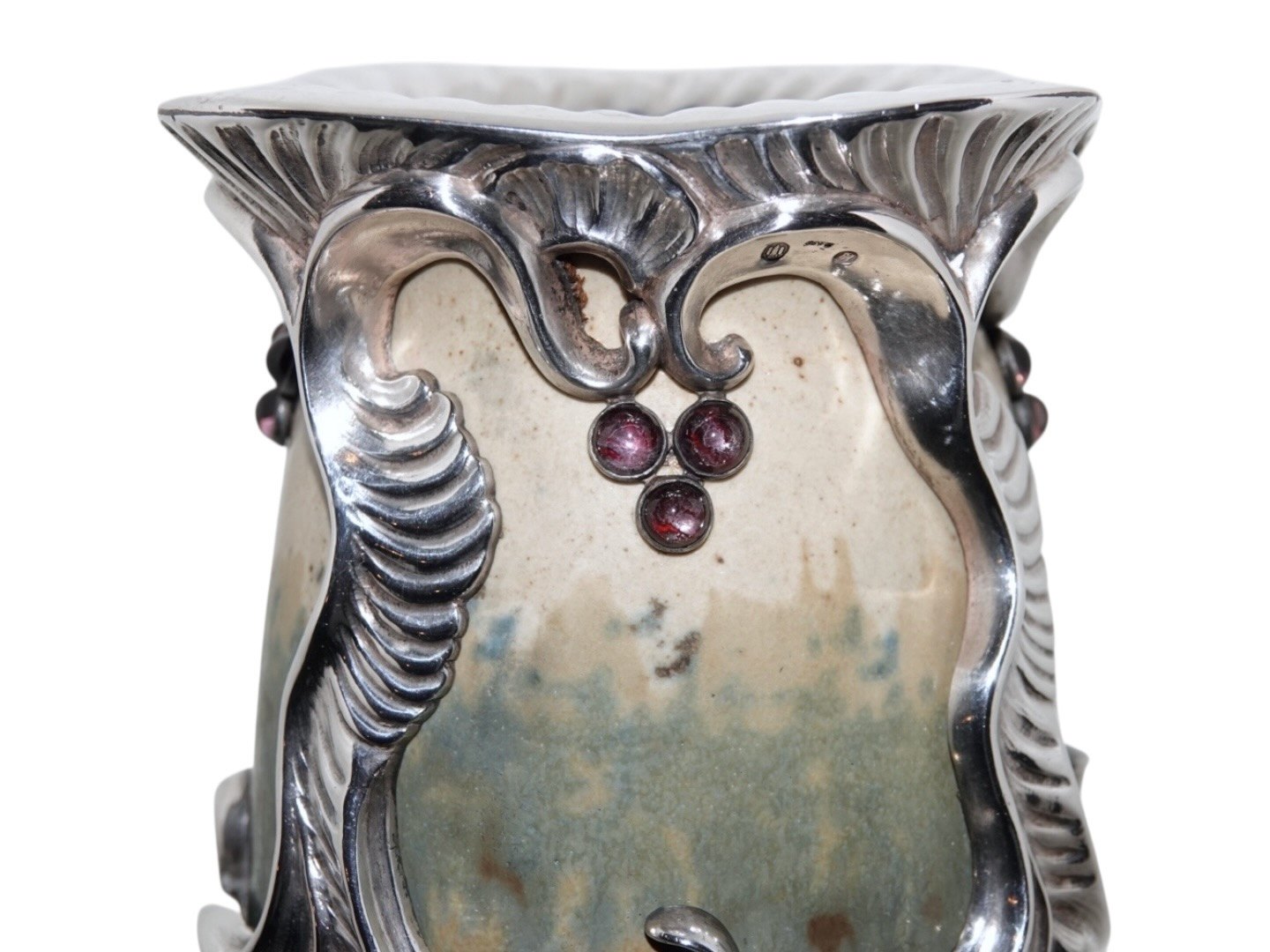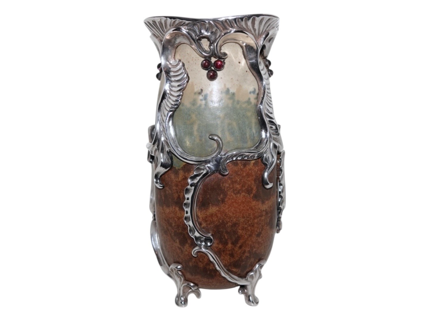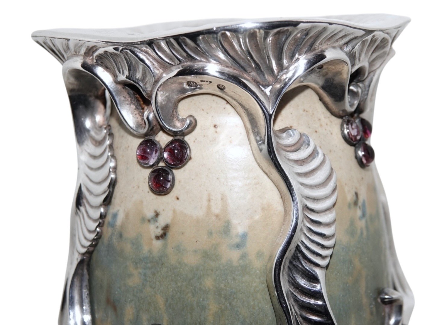 Royal Copenhagen keramik, stor og unik Patrick Nordstrøm vase med ekstravagant og kraftig sølvmontering og ametyster.
