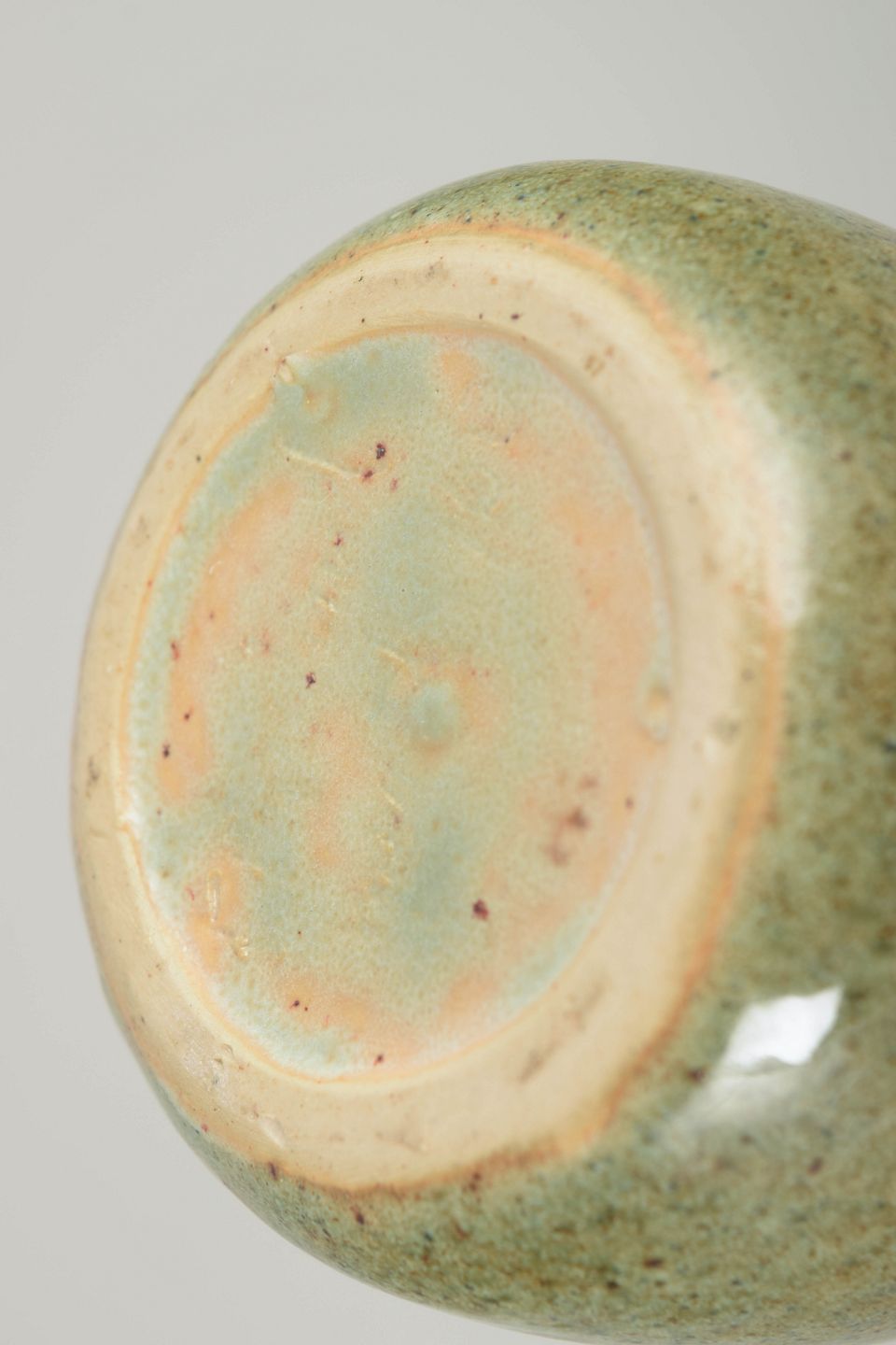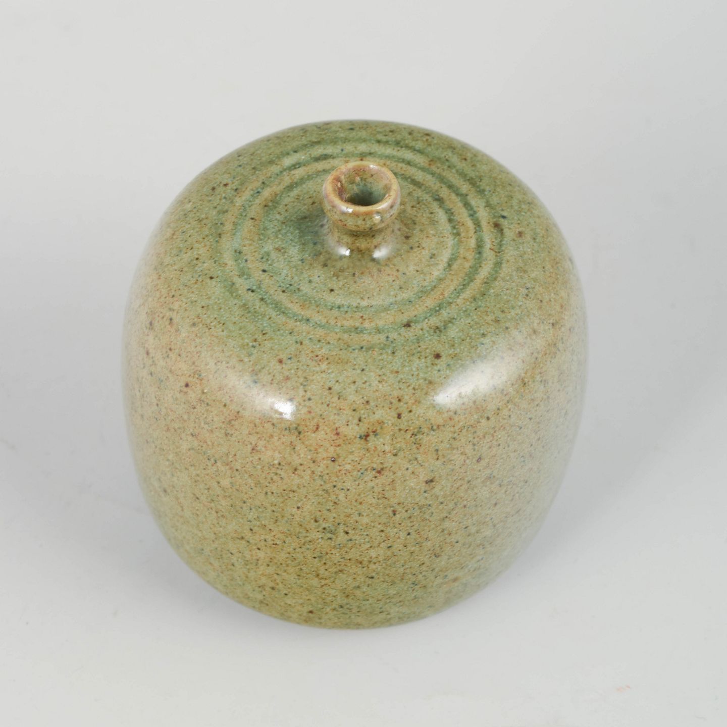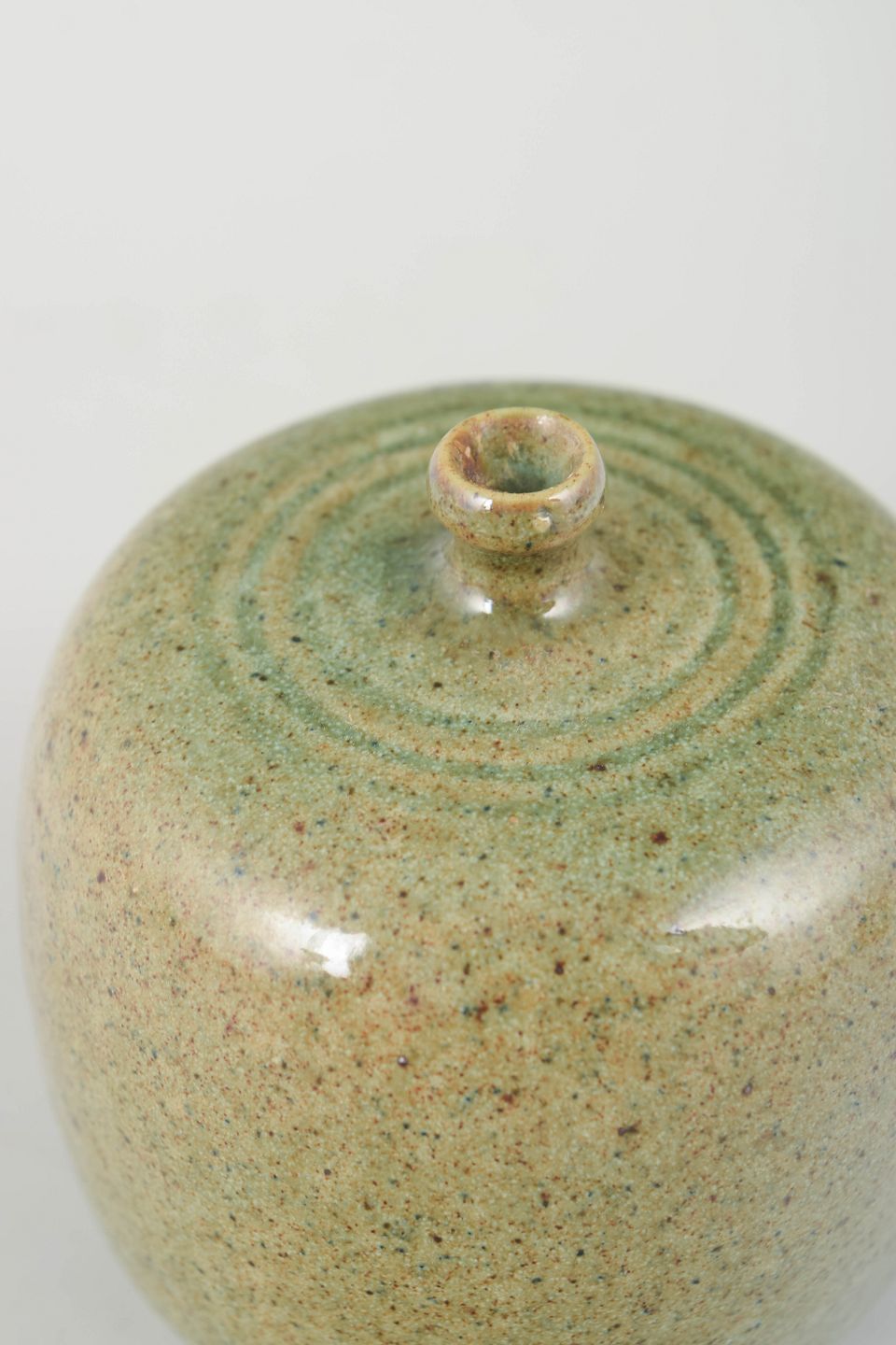 Lille, hånddrejet vase i stentøj med afrundet cylindrisk form og lille, koncentrisk markeret hals. Glasuren er i varme grøn-gulnede nuancer med fint meleret spil, typisk for skandinavisk studiokeramik fra perioden. Signeret.