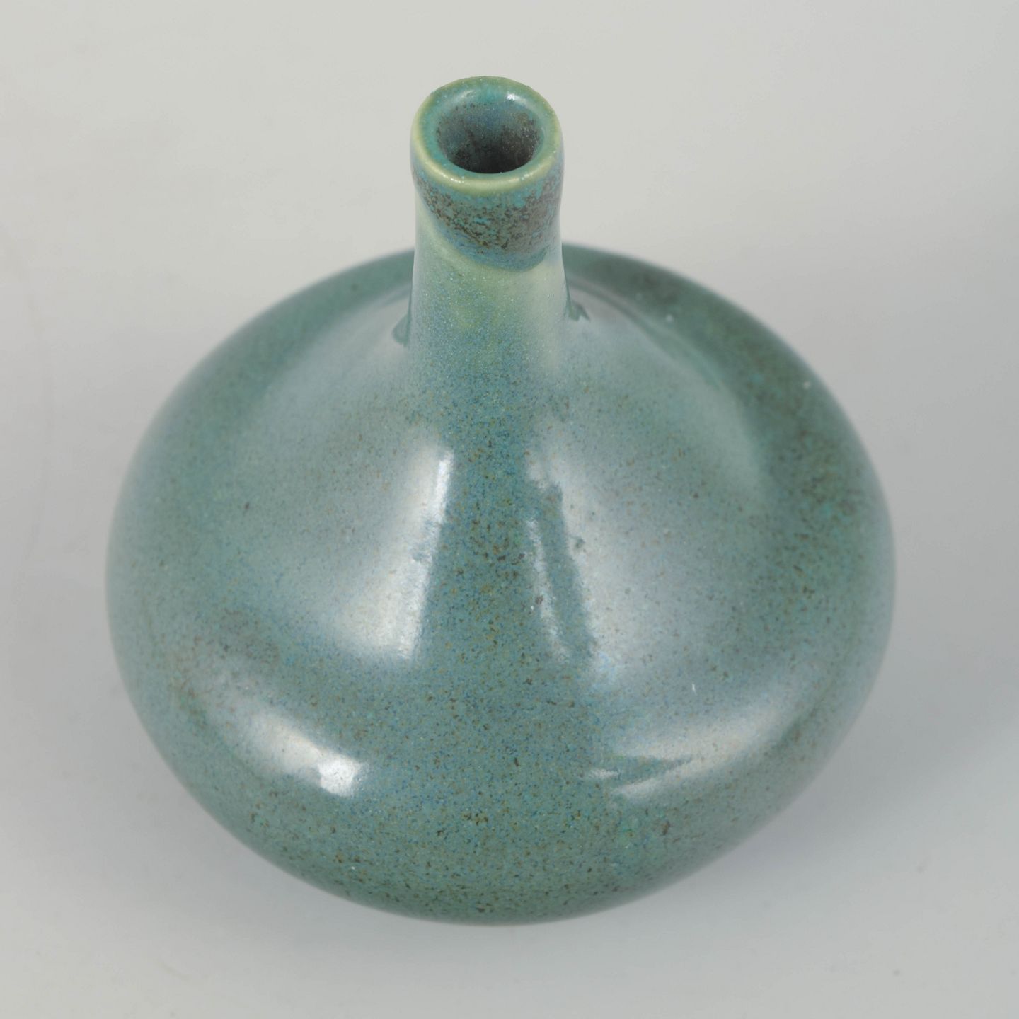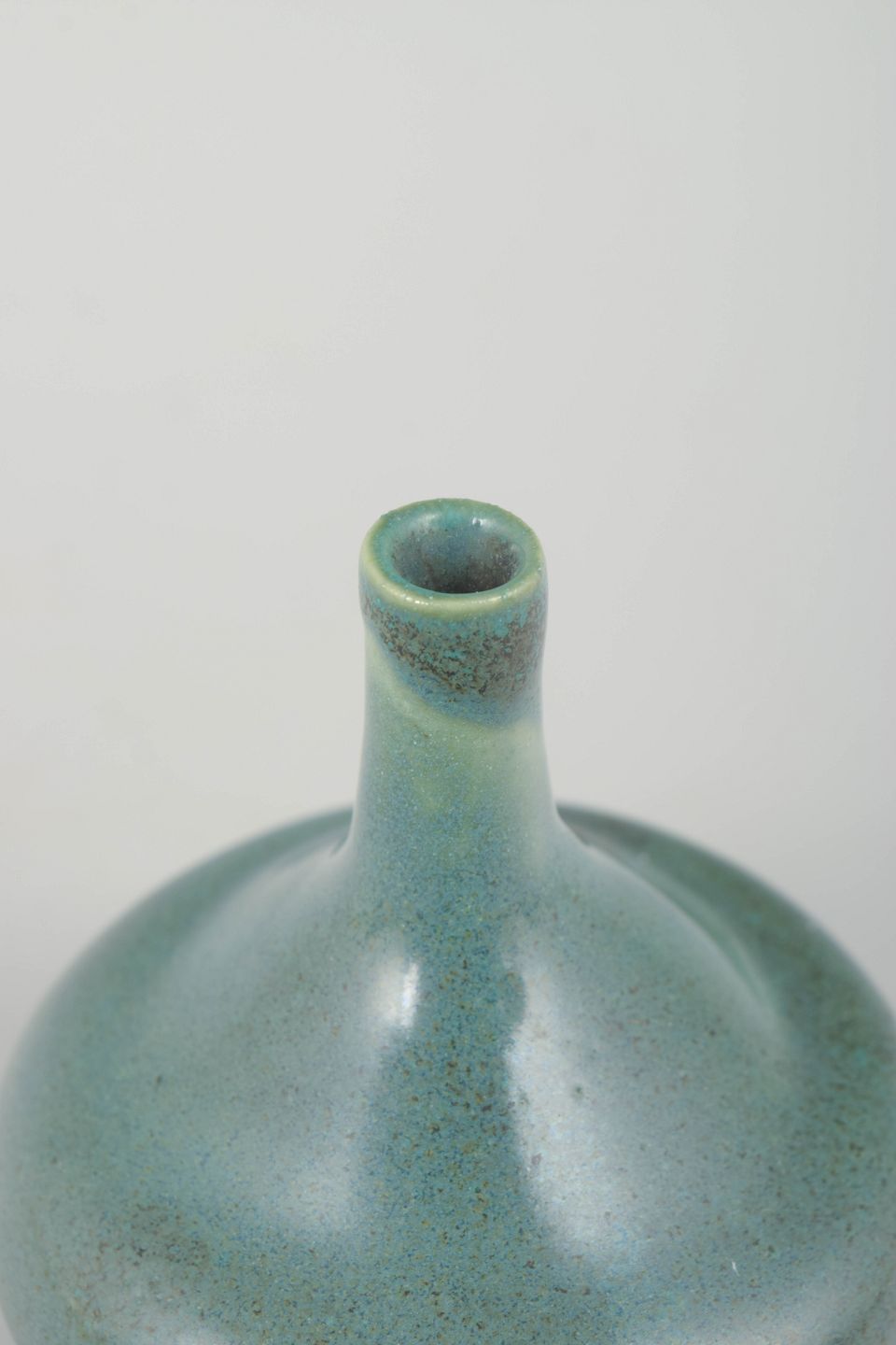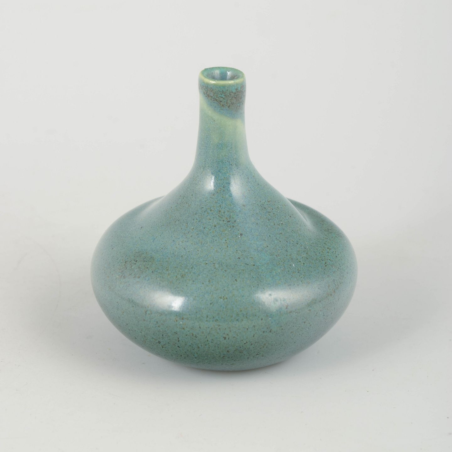 Lille, hånddrejet vase i stentøj med glat, afrundet krop og slank hals. Glasuren er i bløde turkis- og grønne nuancer med let spil og levende overgange, typisk for skandinavisk studiokeramik i perioden.