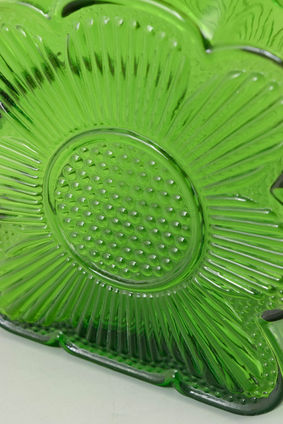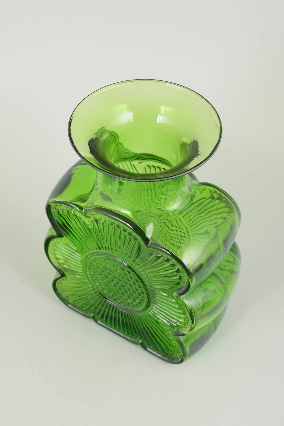 Ikonisk grøn glasvase fra serien Amuletti, designet af Tamara Aladin for Riihimäen Lasi. Modellen er karakteriseret ved sin markante blomsterform og stærke skulpturelle udtryk, typisk for finsk glasdesign i 1970’erne.