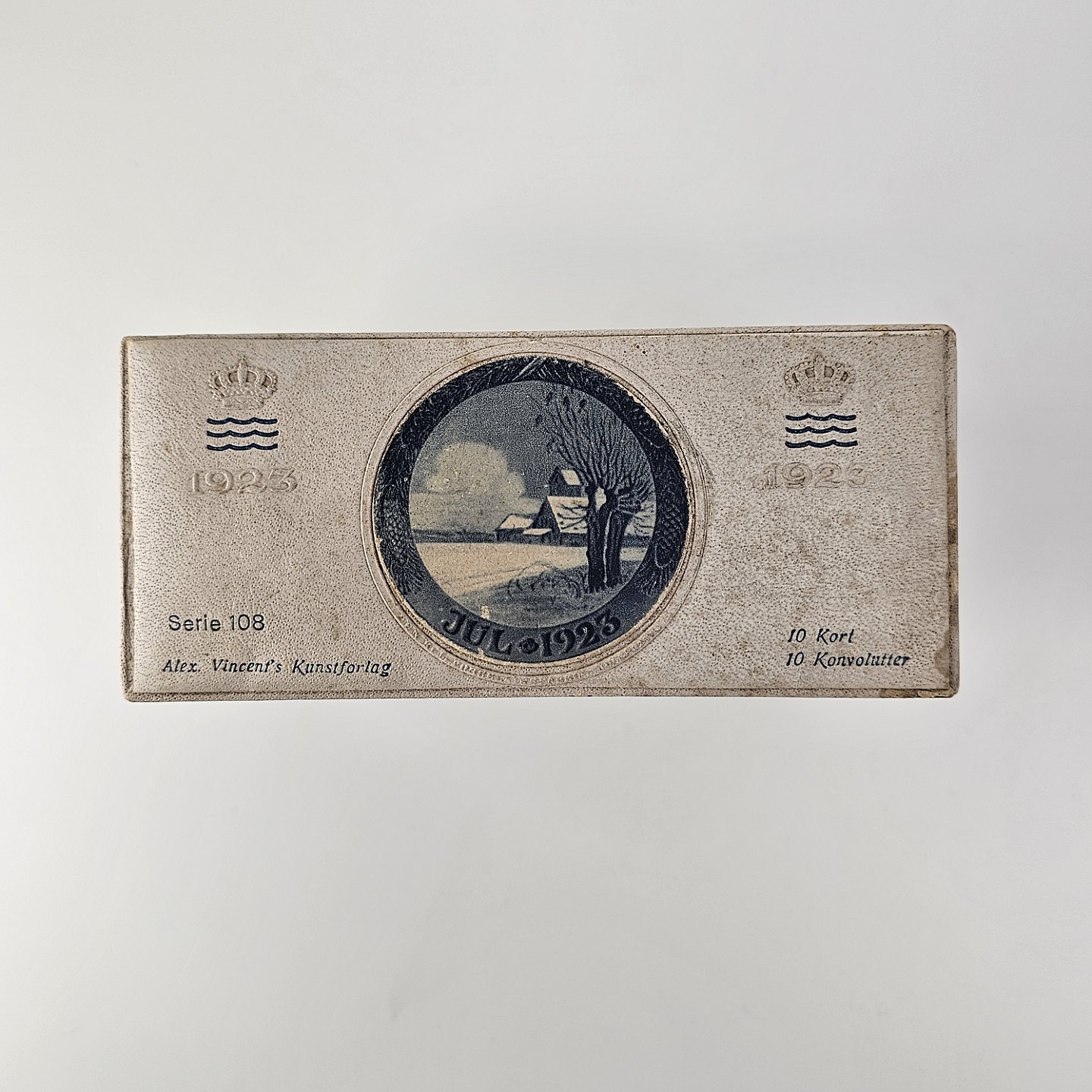 Brevkort med motiv af juleplatte fra 1923 fra Bing & Grøndahl og Royal Copenhagen. 10 kort og 10 kuverter