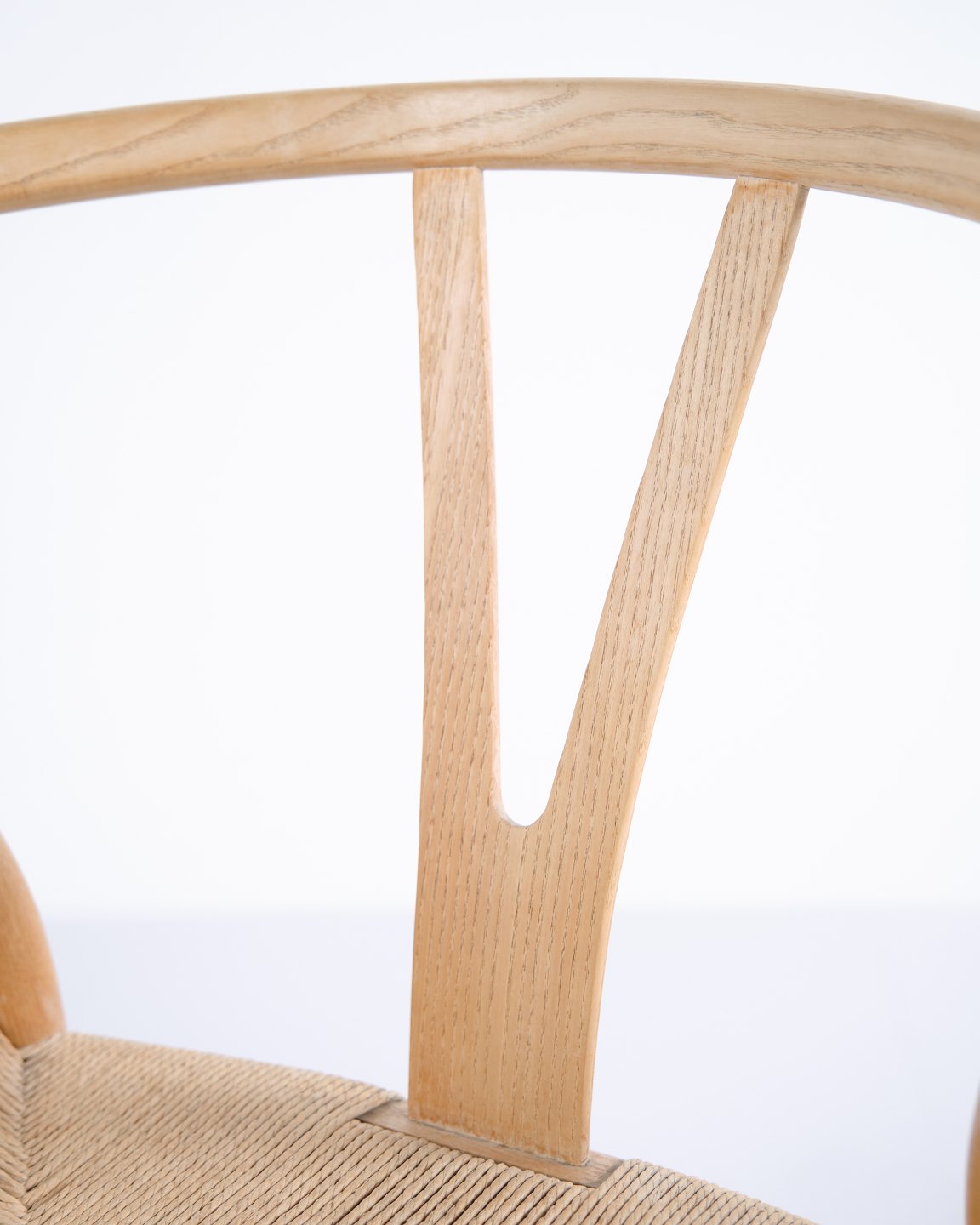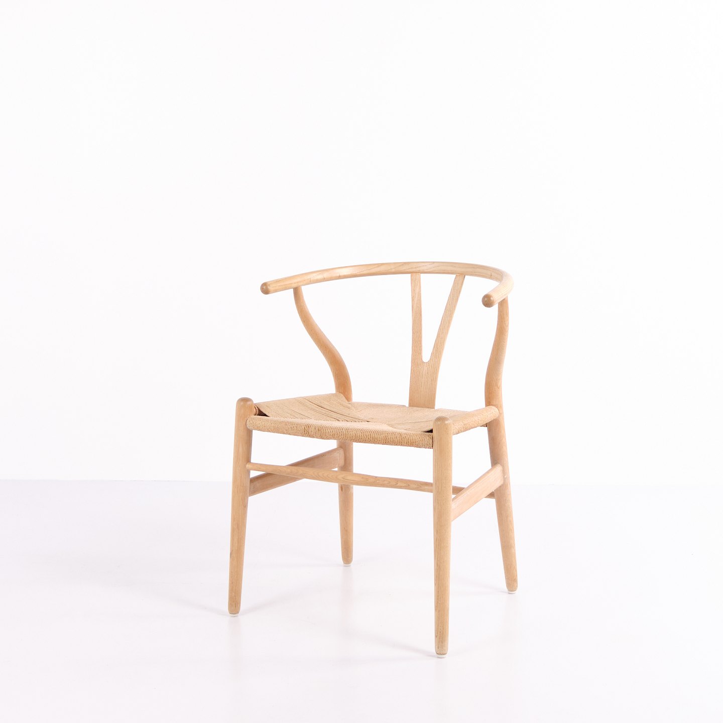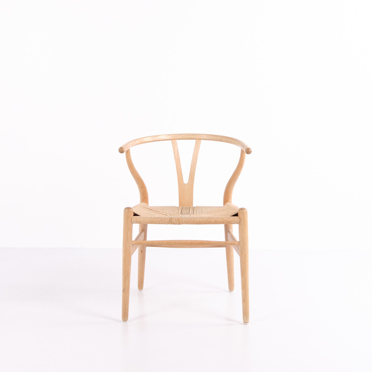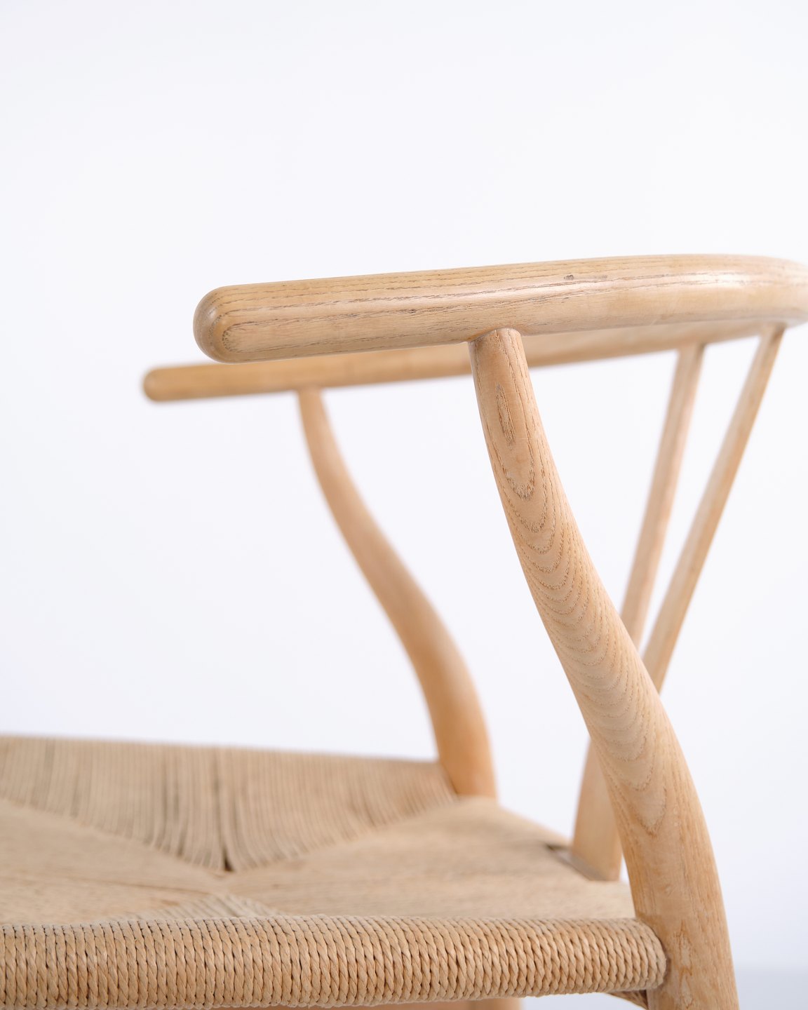 Sæt af CH24 Y-stole designet af Hans J. Wegner og fremstillet af Carl Hansen & Søn i 1960’erne. Udført i eg med sæder i naturflet. Et af Wegners mest kendte designs og et klassisk eksempel på dansk møbelhåndværk.— Designer: Hans J. Wegner