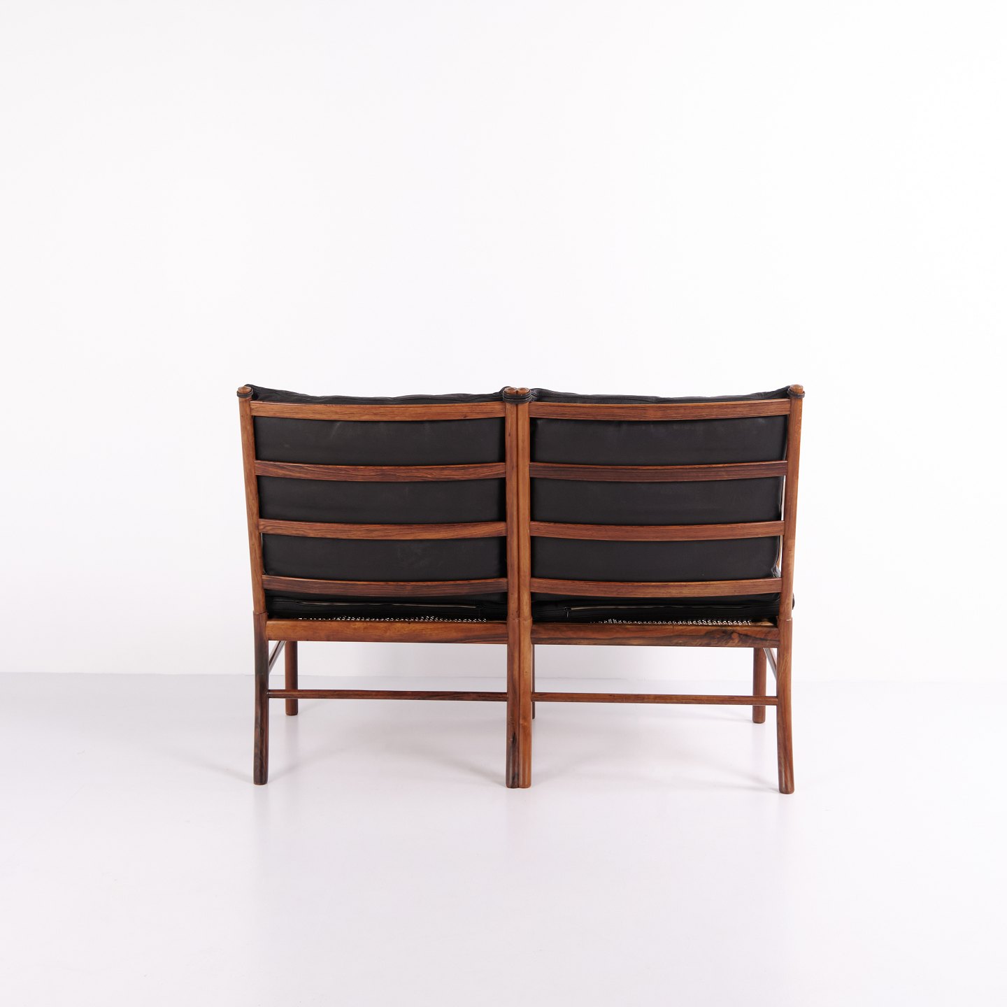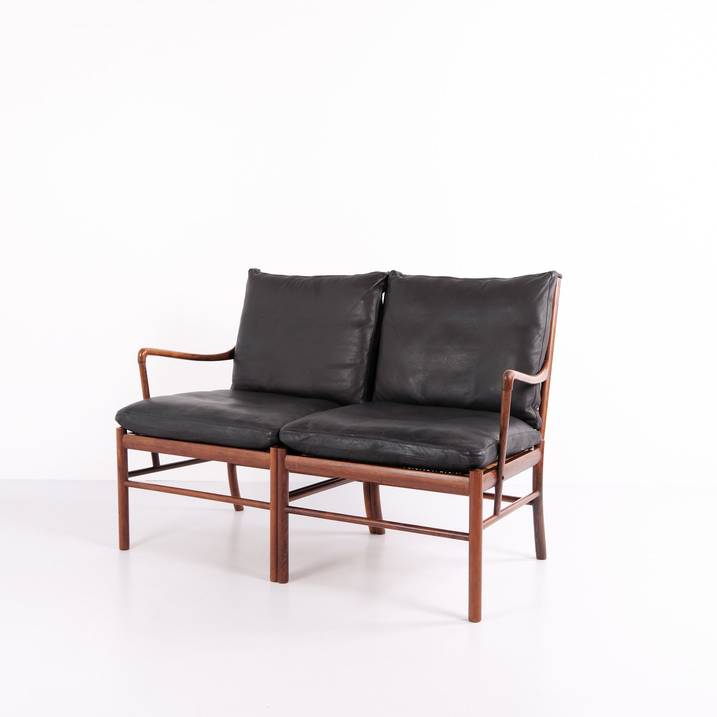 Colonial 2-pers. sofa, model OW149-2, designet af Ole Wanscher og fremstillet af P. Jeppesen omkring 1960. Udført i palisander med flettet sæde og løse hynder. Ole Wanscher var en central skikkelse i dansk møbeldesign og kendt for sit elegante, klassisk inspirerede formsprog. P. Jeppesen var hans faste producent gennem flere årtier og stod for en særligt høj håndværkskvalitet, der gjorde Wanschers møbler eftertragtede både i samtiden og i dag. Colonial-serien er blandt hans mest ikoniske værker.— Designer: Ole Wanscher