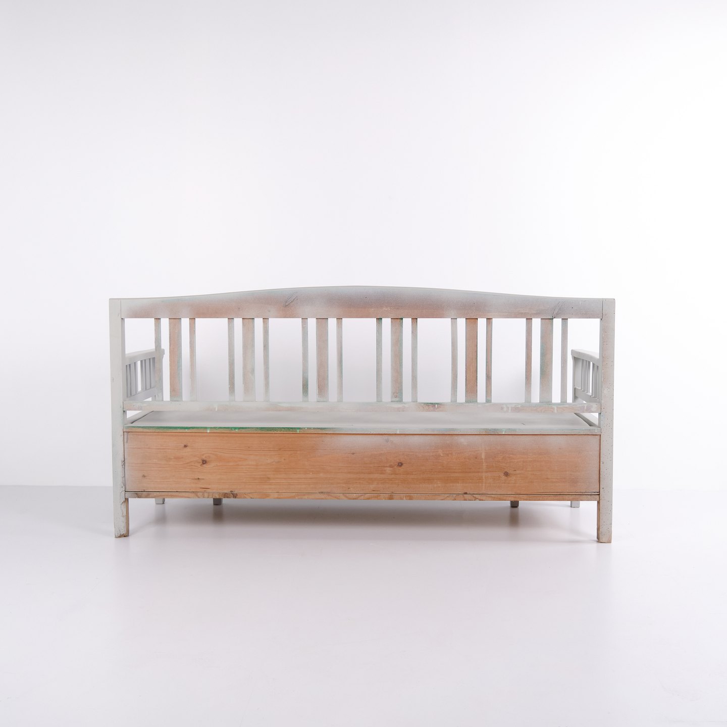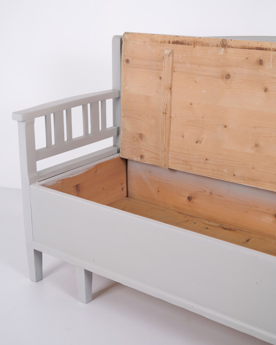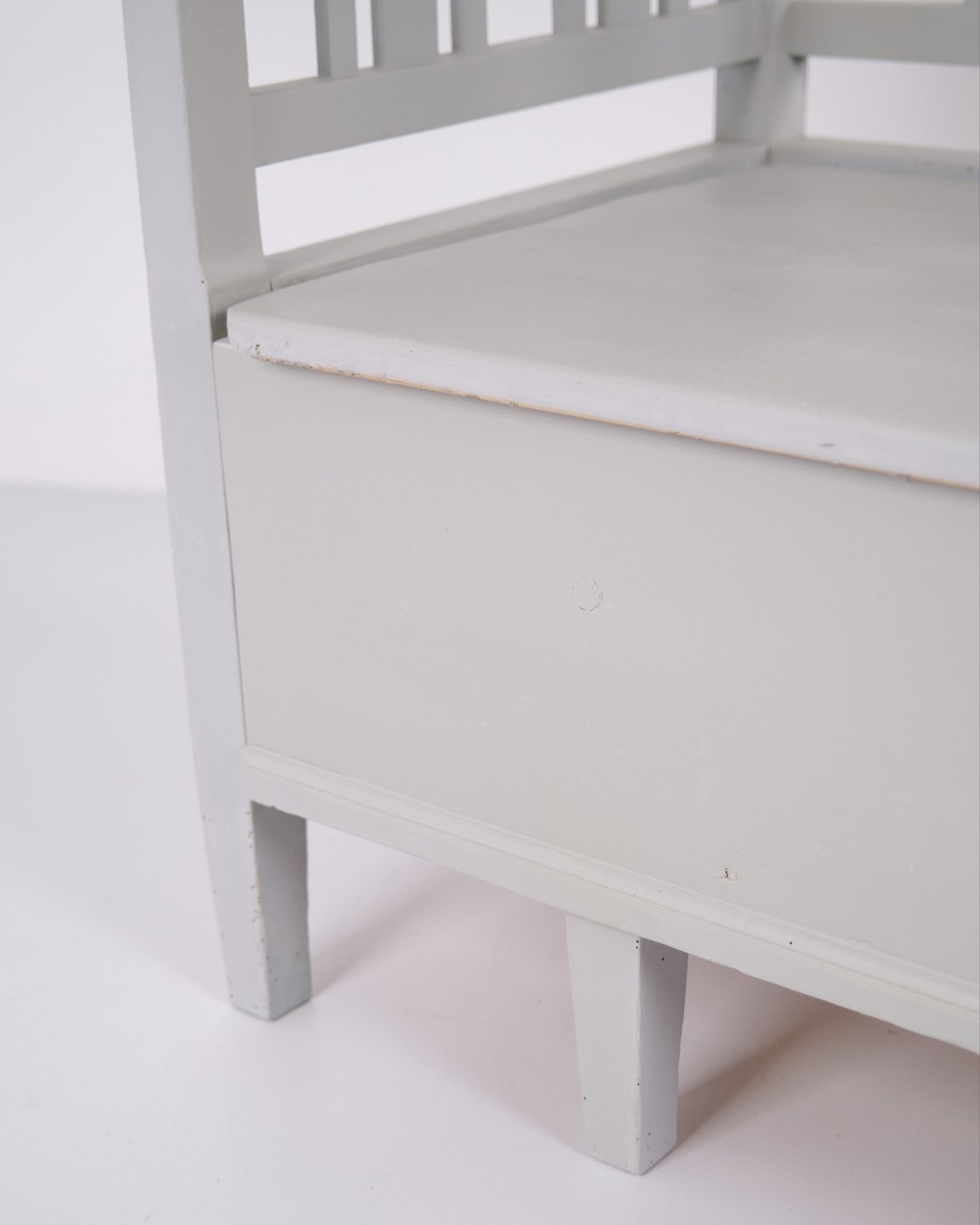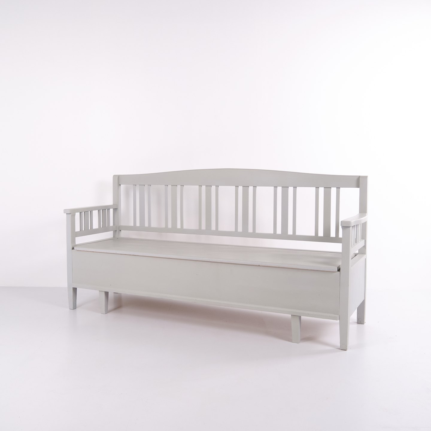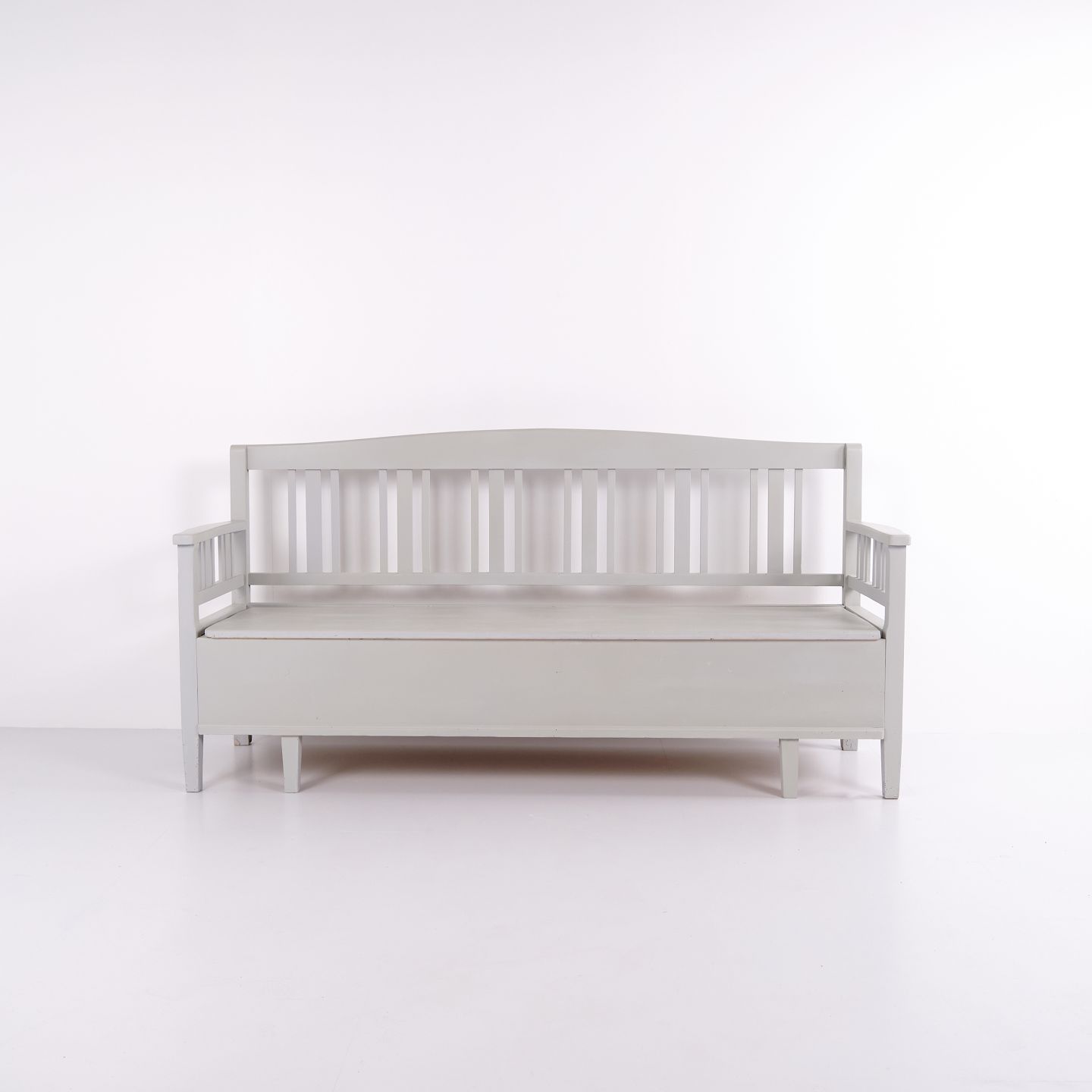 Svensk slagbænk fra ca. 1860’erne, udført i fyrretræ og gråmalet i senere tid. Klassisk skandinavisk møbel med dekorative bemalinger og god opbevaringsplads under sædet. Velbevaret antikt møbel med tidstypiske detaljer.— Oprindelse: Sverige
