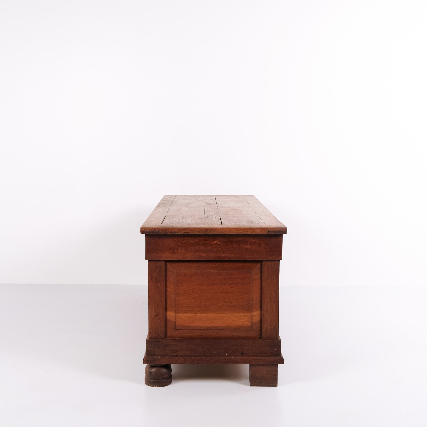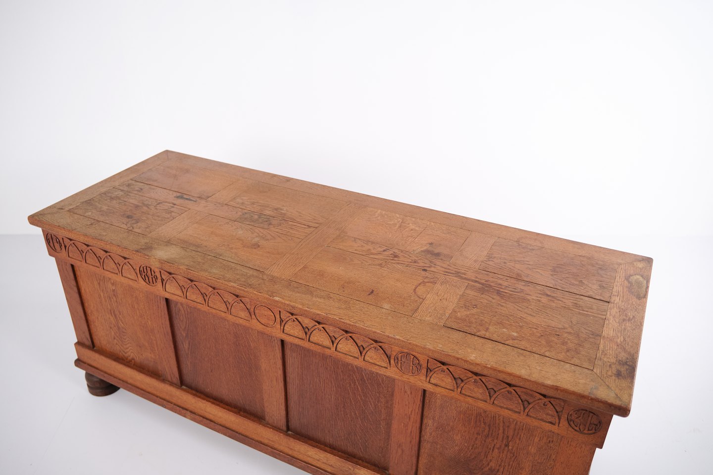 Kiste/skænk fra ca. 1920’erne, udført i egetræ med dekorative udskæringer og runde ben. Møblet har rummelig opbevaringsplads og klassiske detaljer fra perioden. Solidt antikt møbel i flot stand.
