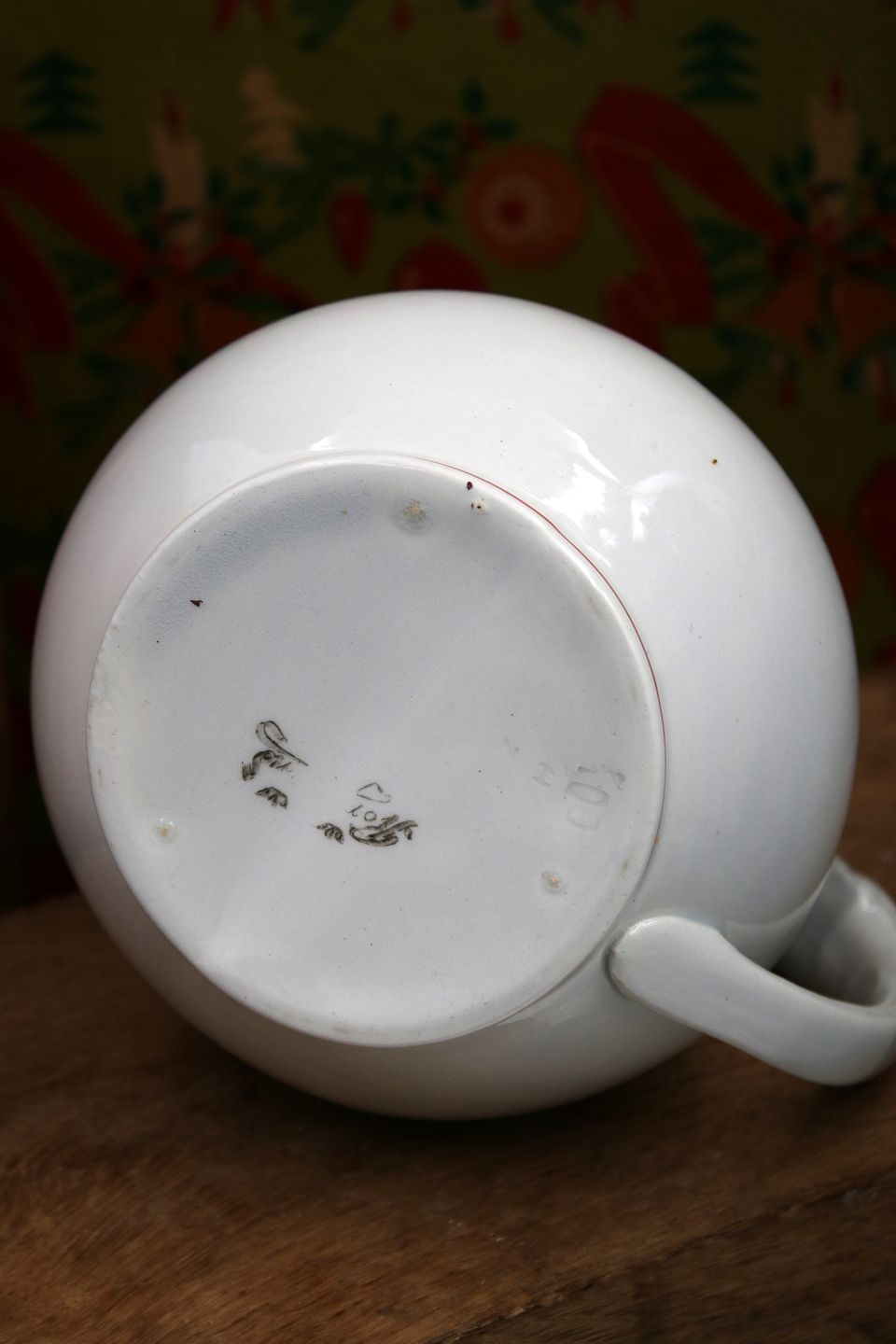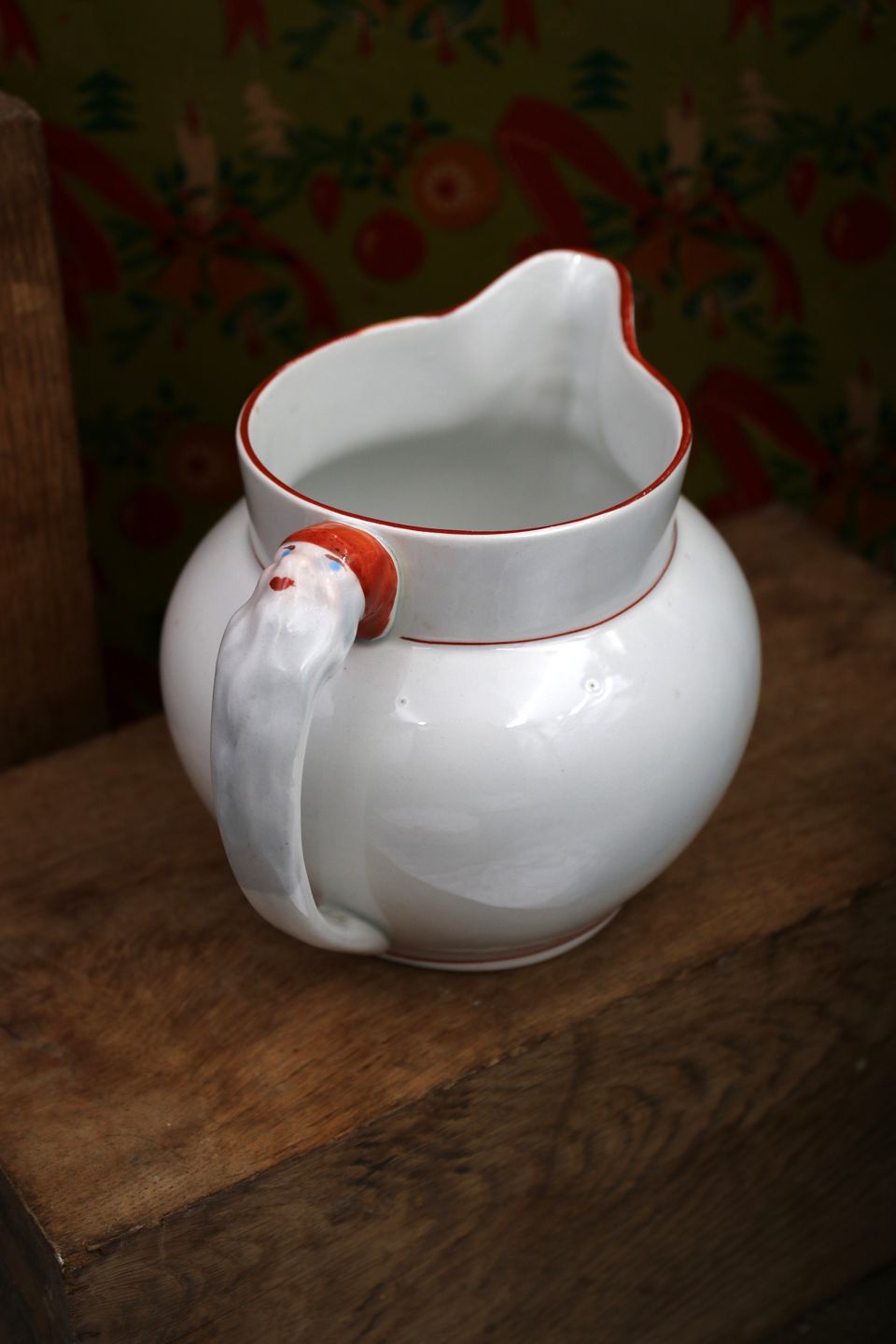 Gammel svensk julekande i fajance med nisser på hældetuden og på hanken. H:12m. Dia.: 13,5cm.Jule kanden er fra Rörstrand fajance fabrik.