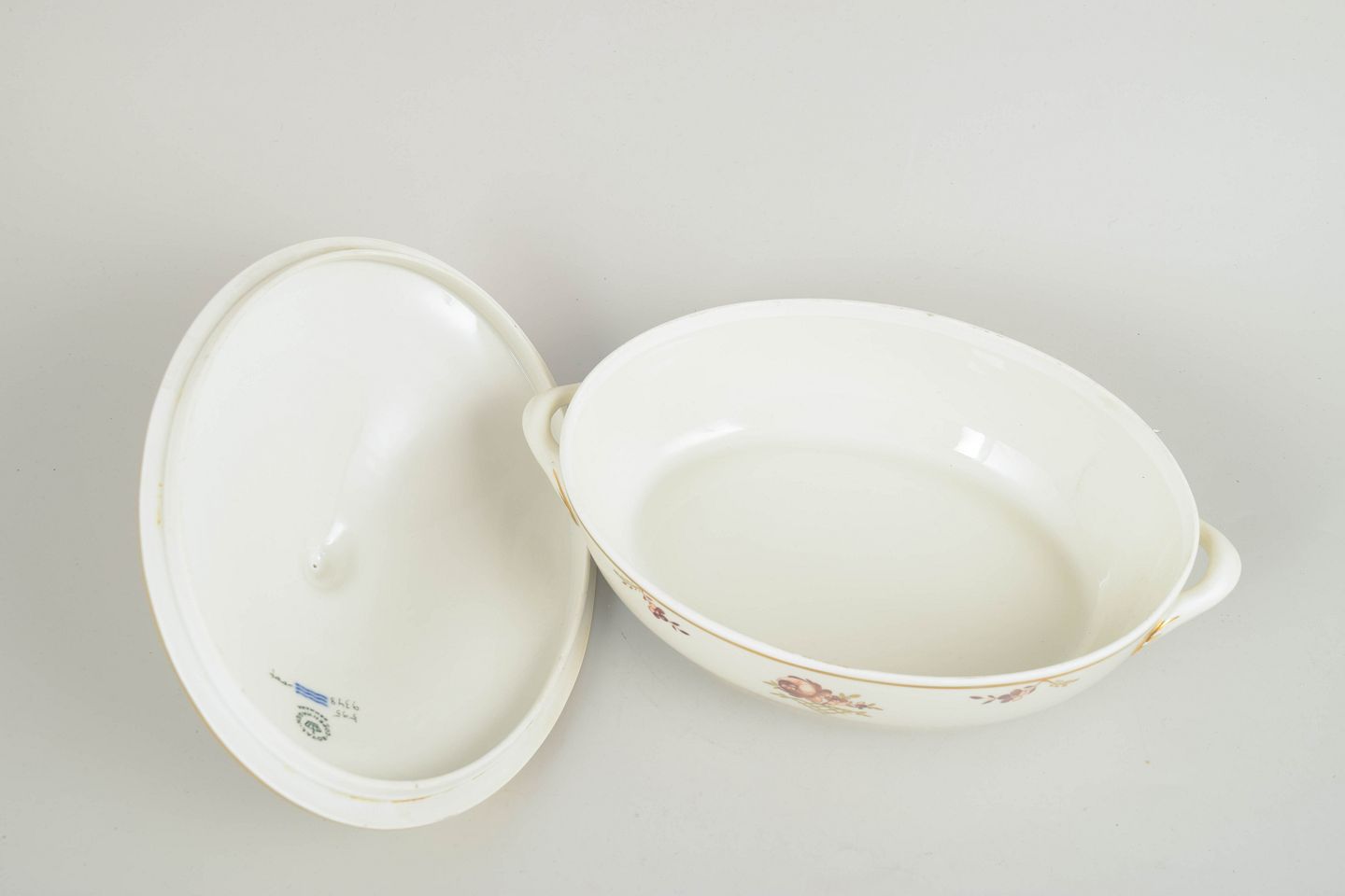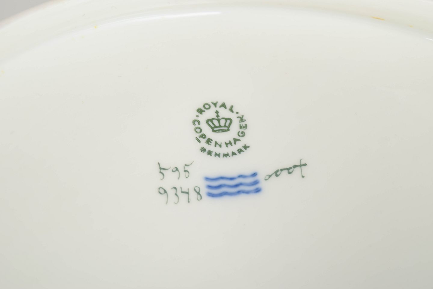Elegant oval terrin i porcelæn fra Royal Copenhagens klassiske “Guldkurv”-serie, model 595/9348. Udført i 1. sortering med forgyldte detaljer og håndmalede blomsterdekorationer. Med låg.