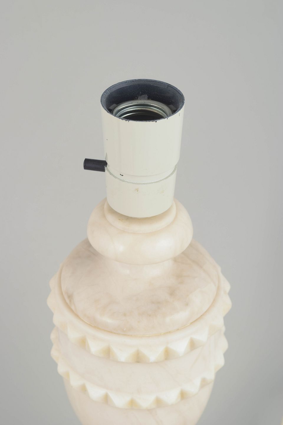 Italiensk Marmor Bordlampe, 1970’erne.Skulpturel bordlampe i lys marmor med dekorativt bånd af små udskårne takker omkring det øvre midterparti. Den klassiske urneform kombineret med den runde fod giver lampen et blødt, harmonisk og dekorativt udtryk.