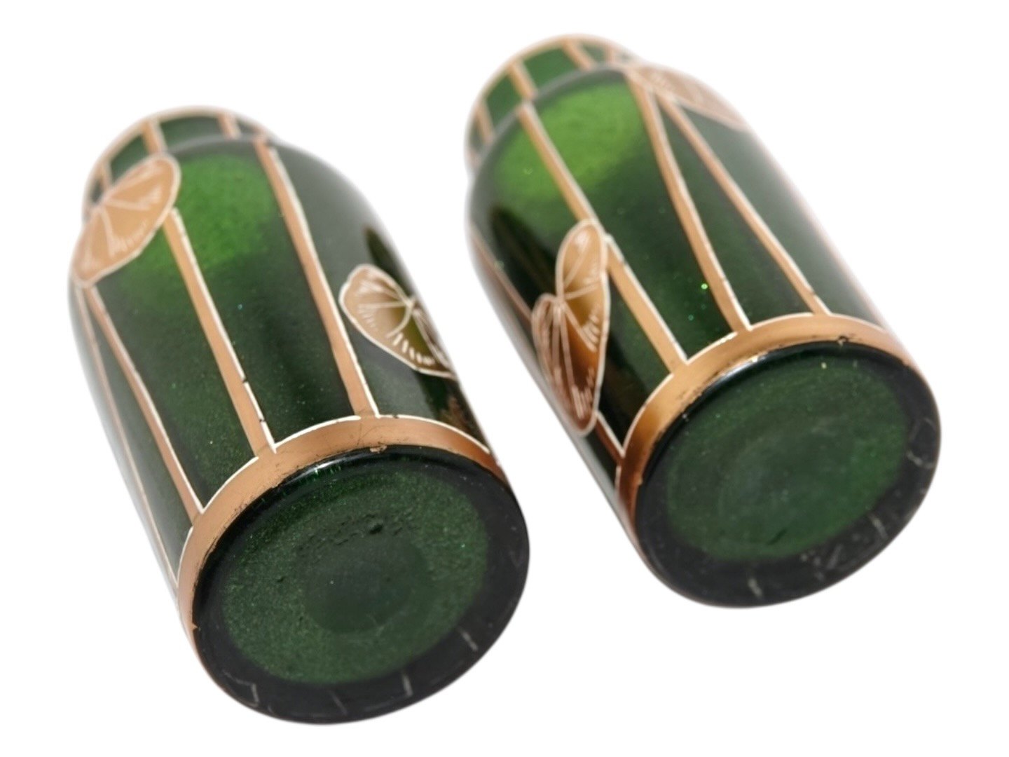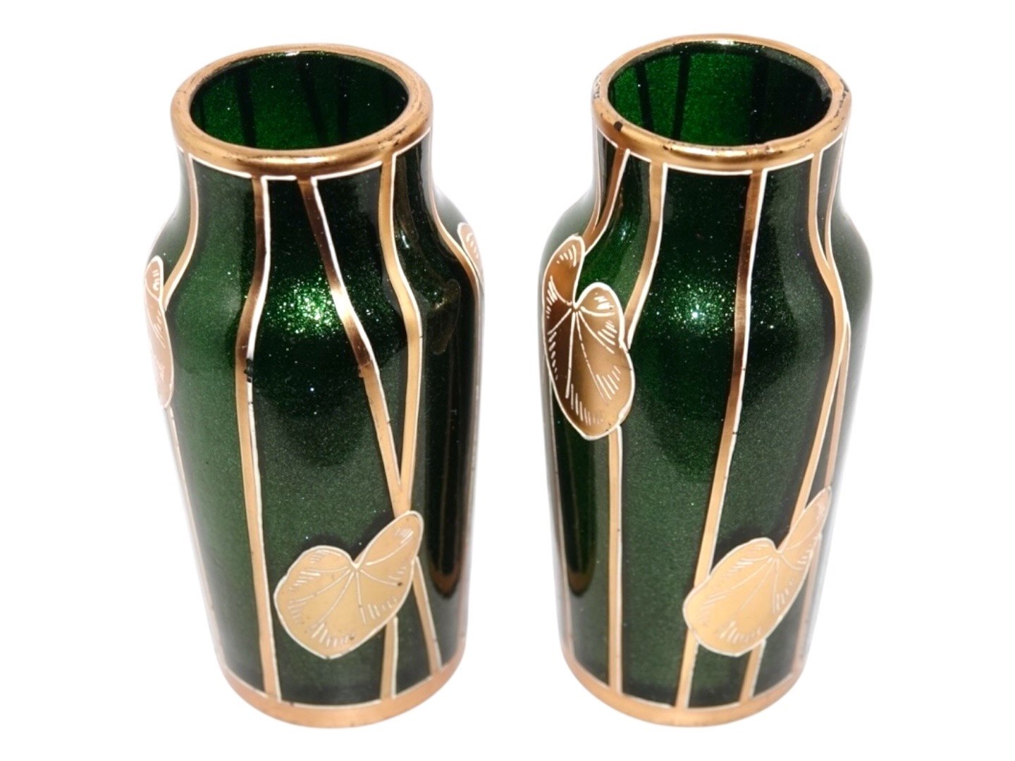 To små Jugend (Art Nouveau) grønne glas vaser med gulddekoration fra omkring 1900 til 1920.