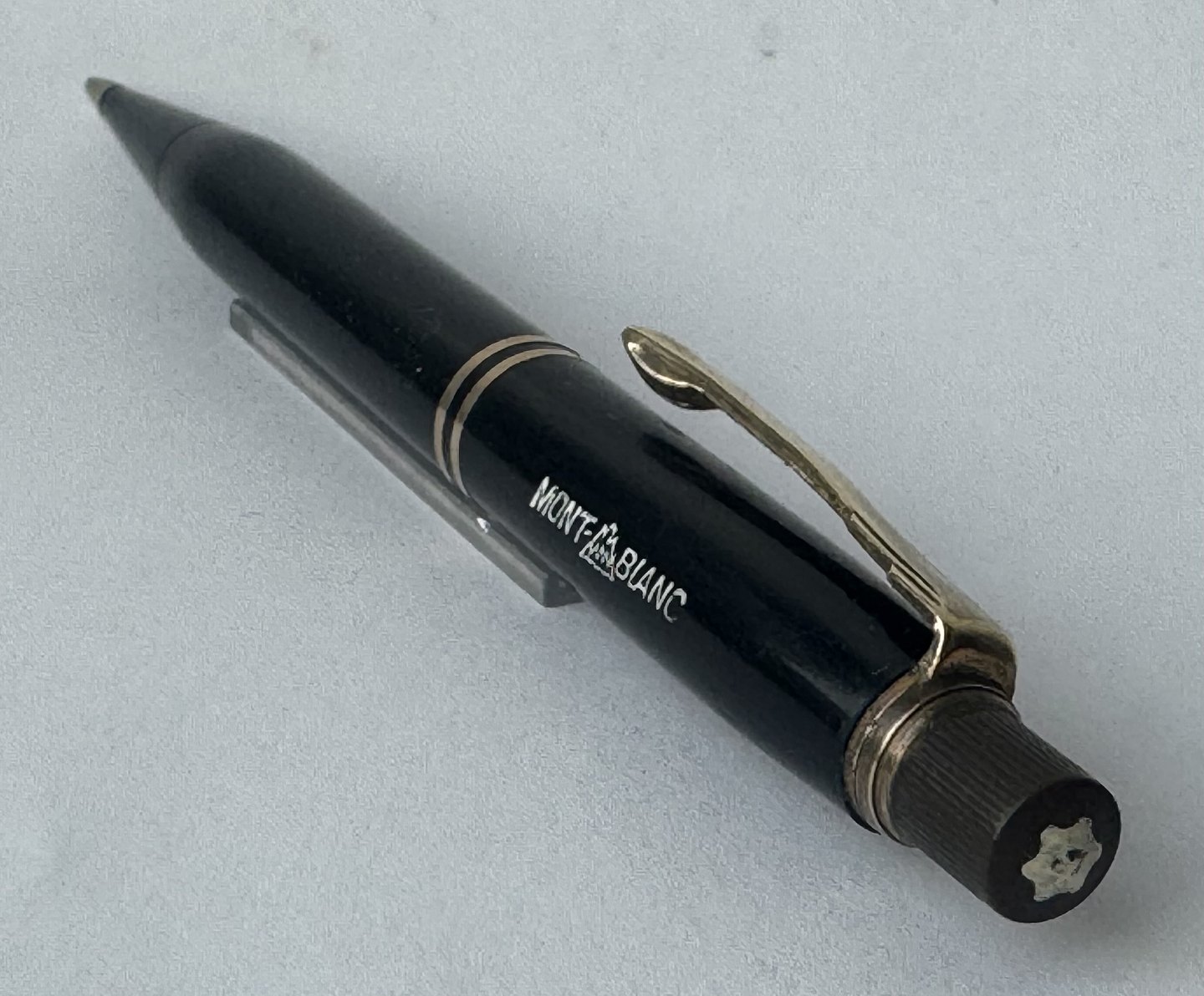 Sort Montblanc no. 46 stiftblyant. Fremstillet i Tyskland i 1950’erne. I god stand. Klar til at blive brugt. Der skal dog tilkøbes Bly-stifter før end den igen er skrivedygtig.