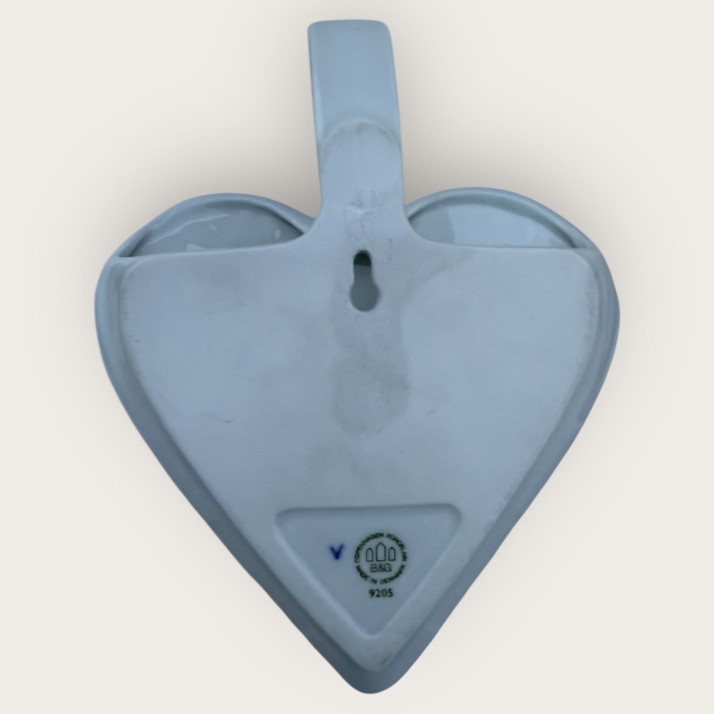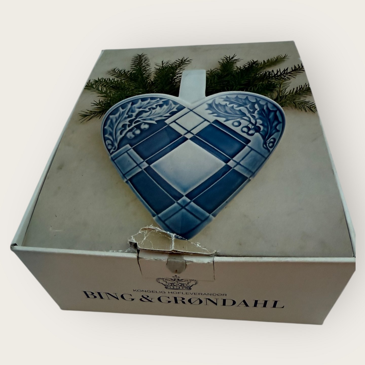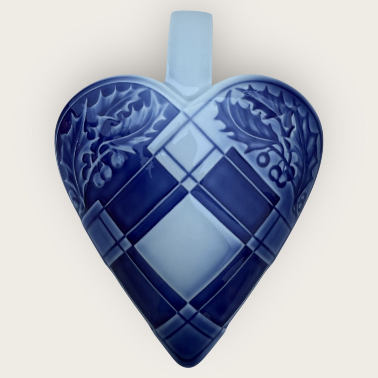 Bing & Grøndahl, Julehjerte til ophæng dekoreret med kristjørn, #9205, Mål 20,5x15,5cm, 1. sortering i fin stand - i original æske - denne dog med brugsspor.Lager: 1
