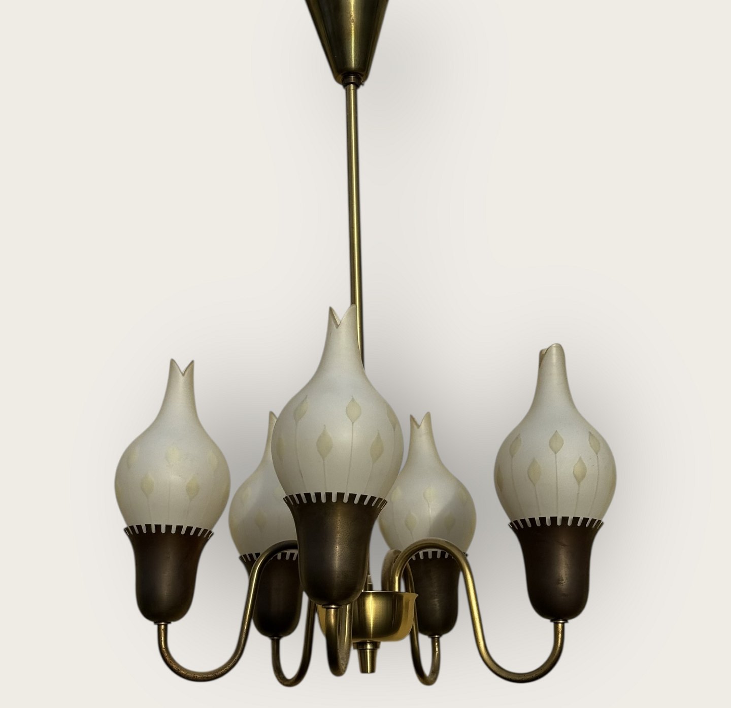 Lysekrone i messing med glasskærme, 5 store skærme i tulipan form, Sandsynligvis fremstillet hos Fog og Mørup, hver skærm er ca. 20cm høj og 10cm i diameter, selve lampen er 42cm i diameter og 67cm høj *Flot stand*Lager: 1
