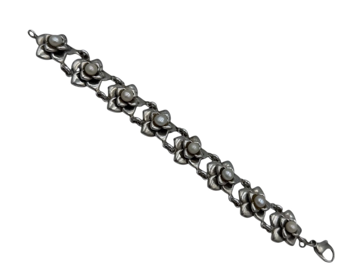 Tungt sterlingølv armbånd med blomster og perle lignende sten.Stemplet "925S SATI".