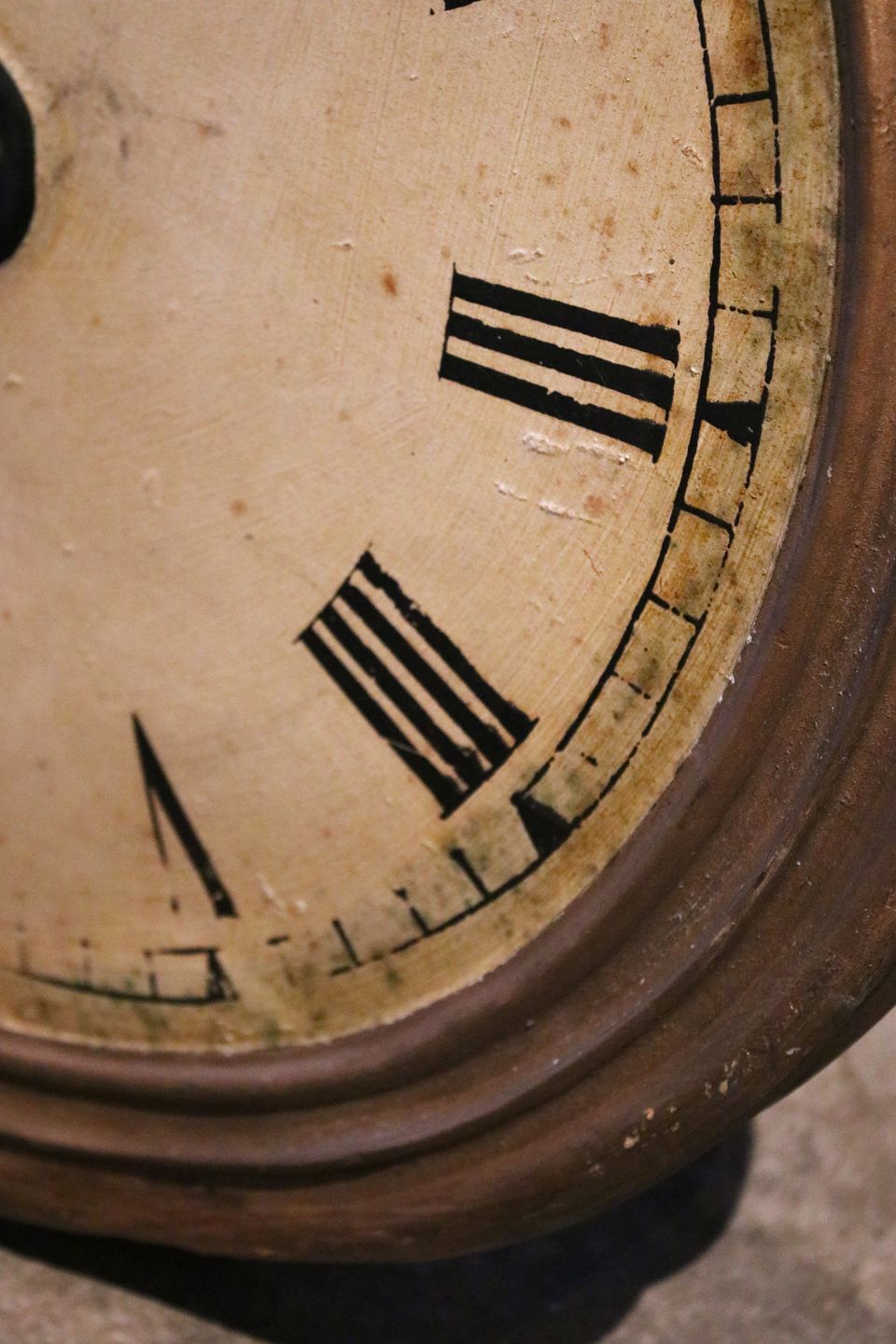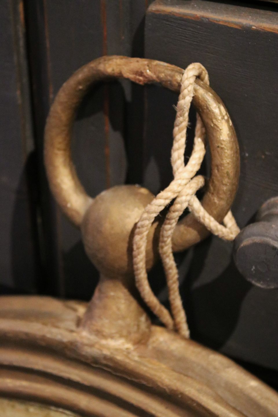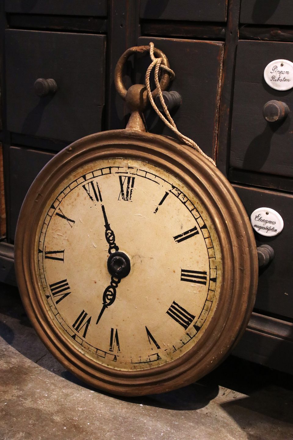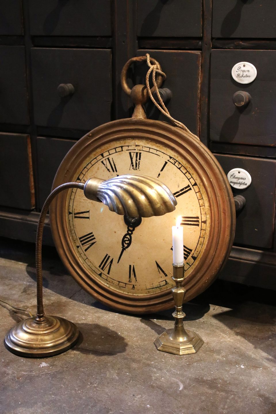 Dekorativt gammelt "ur" i træ fra urmager butik med gammel bemaling og med en rigtig fin patina. H: 68cm. Dia.: 47cm.Der er urskive på begge sider.