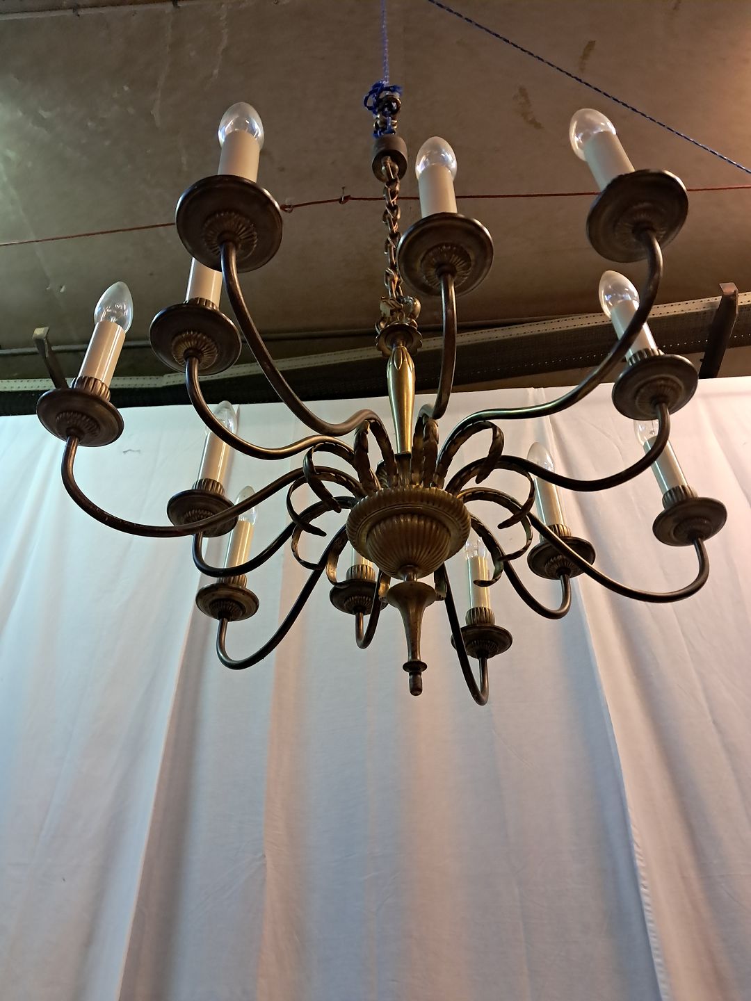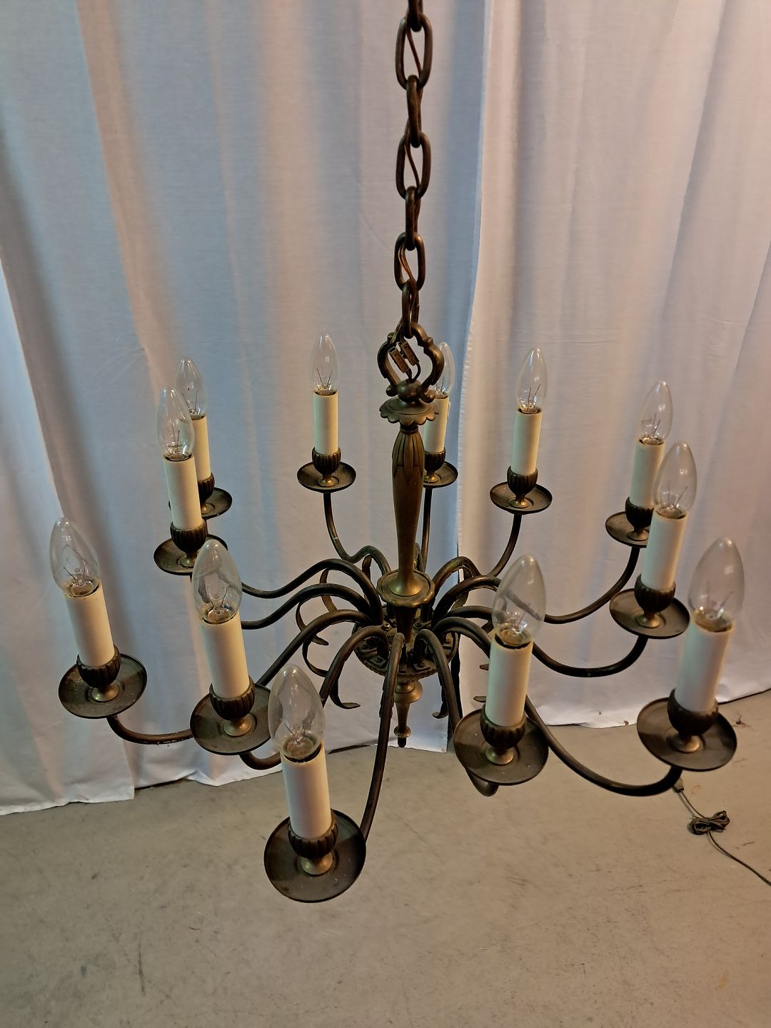 12-armet lysekrone i messing, fra 1950erne.Den har brugsspor.
