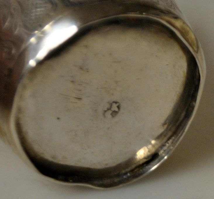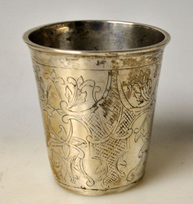 Jens Kieldsen Sommerfeldt (1692 - 1772) Sølvsmed i Aalborg, Danmark: Sølvbæger. Med kartouche. Stemplet. Højde.: 7,5 cm. Vægt: 79 gram.Med indgravering ved den øverste kant: R.K.S - A.P.D - J. Jensen Hamlshøj.