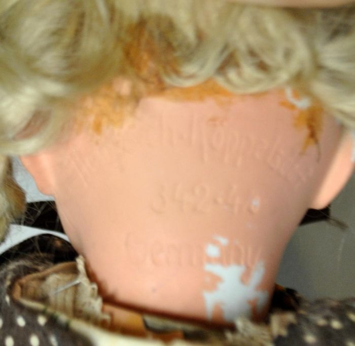 Heubach - Köppelsdorf dukke no. 342.4/0, 19. årh. Tyskland. Stemplet. Hoved og krop af porcelæn. Blå øjne, der kan åbne og lukke med vipper af hår. Tøj af bomuld. L: 42 cm.Emne nummer: 28702