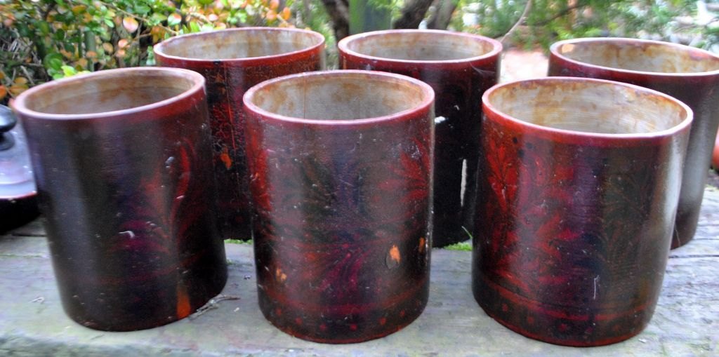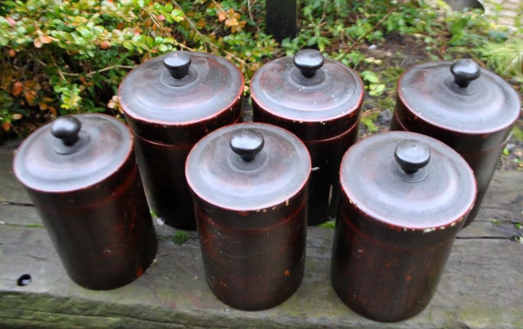 Samling russiske trædåser, 19. årh. Drejet og udhulet tre. Med udvendige bemalinger. Lakeret. Indvendig med sølvfarve. I alt 5 stk. NB: Sælges kun samlet!Emne nummer: 28748
