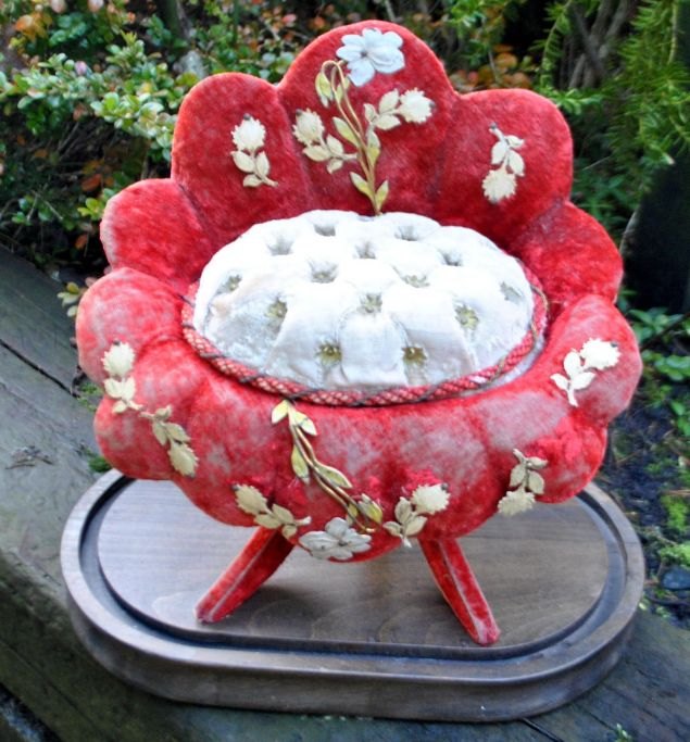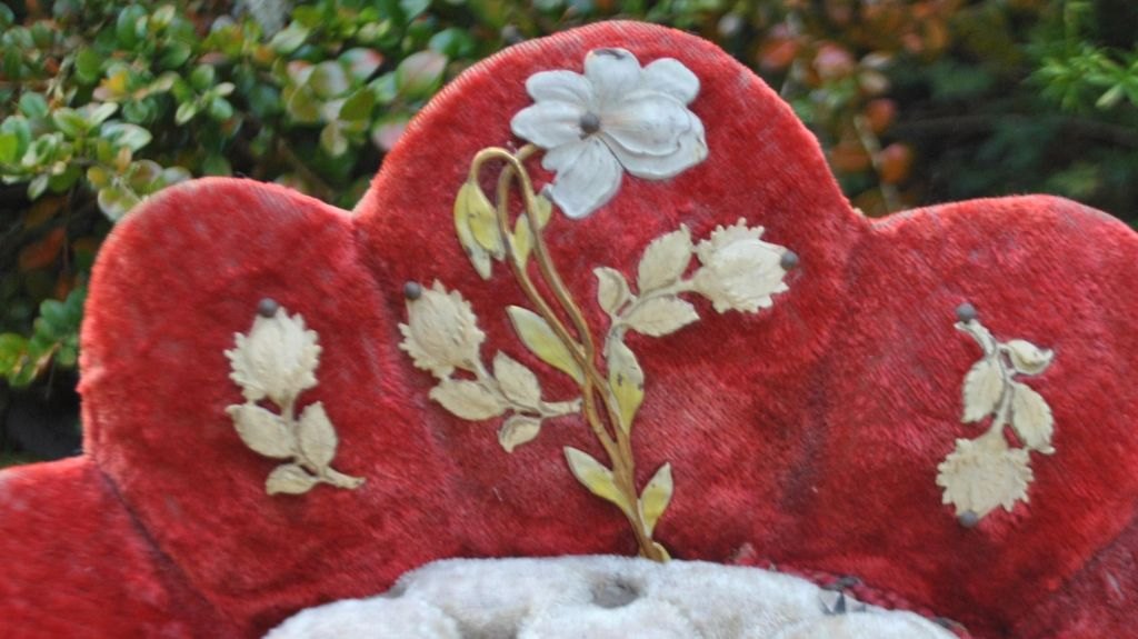 Fransk glas kuppel opsats, c. 1870. Globe de mariée. Indvendig med stol i rødt plyds og silke med pålagte bemalede blomster i metal. Sæde i hvidt plyds med små metal stjerner. Stole højde.: 30 cm. B.: 31 cm. Glasklokke på træfod. H: 43 cm.Stolen har været benyttet til at fremvise smykker og memorabilia fra bryllup.