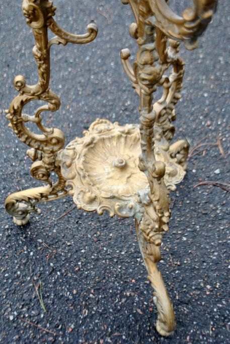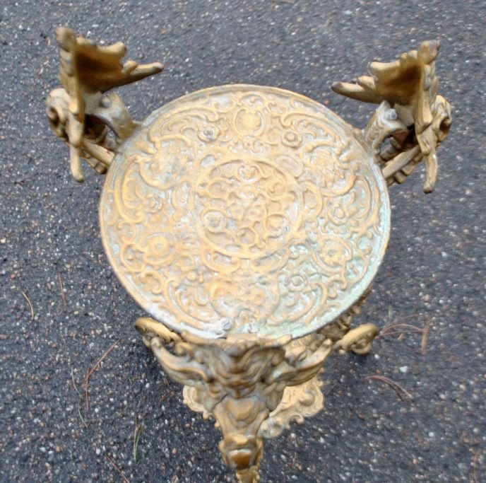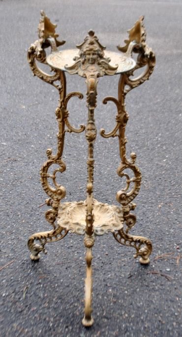 Piedestal i jern, ca. 1870, Danmark. På tre ben med dekorationer af engle og delfiner. H.: 75 cm.Emne nummer: 28756