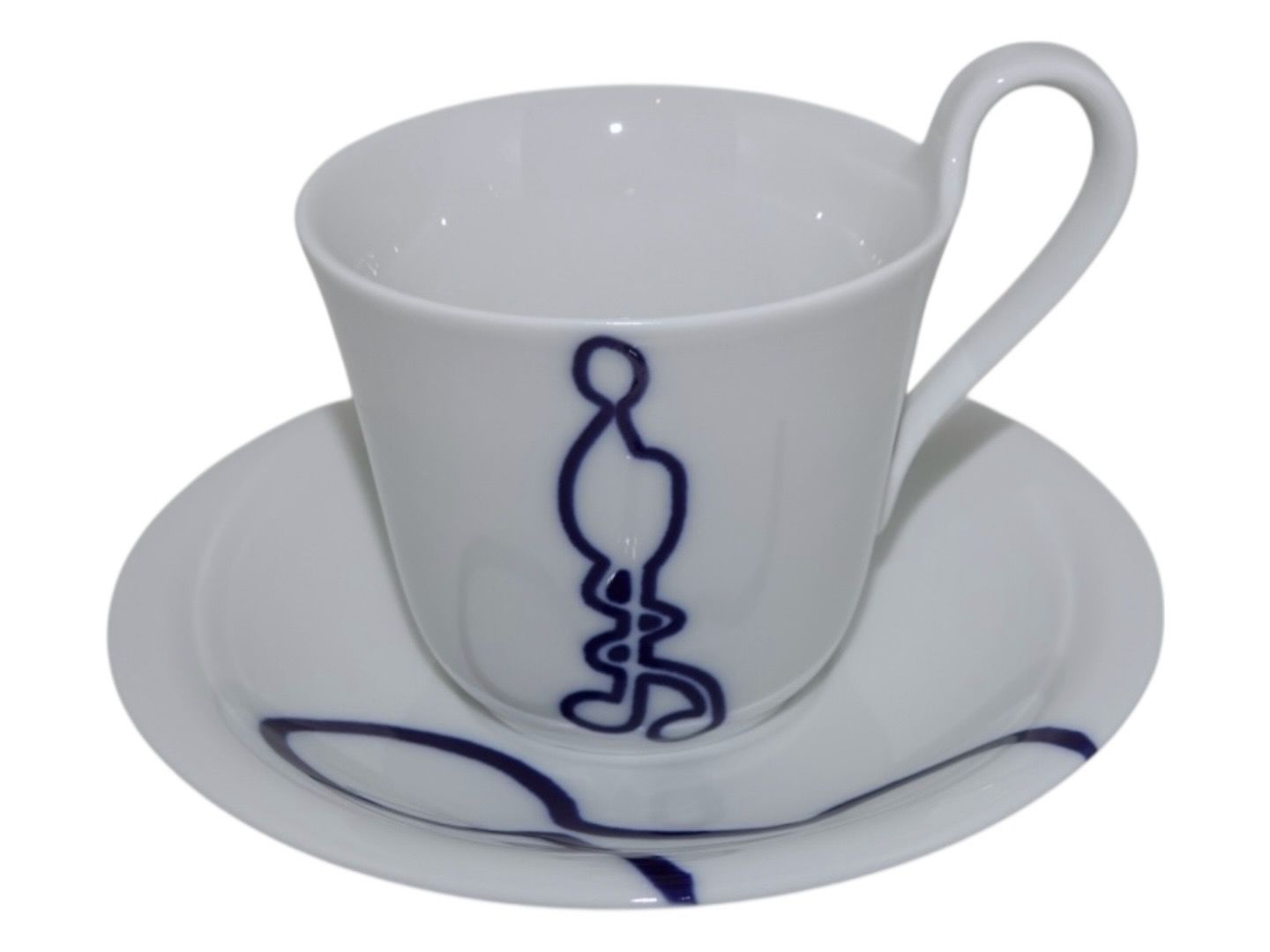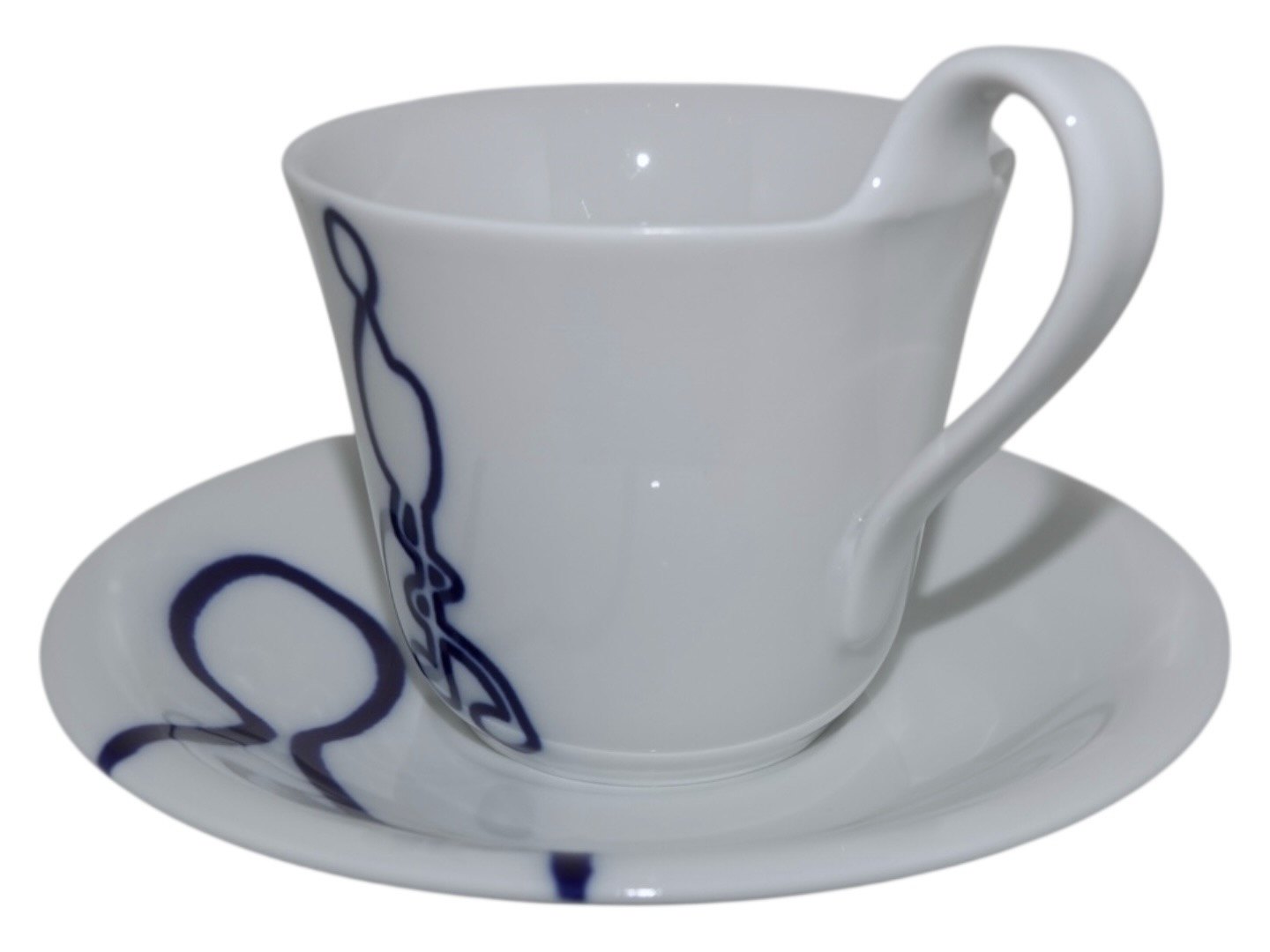 Royal Copenhagen Musica, højhankskop med tilhørende underkop. Dekoration E.Dekorationsnummer 093E (kop) og 094E (underkop).