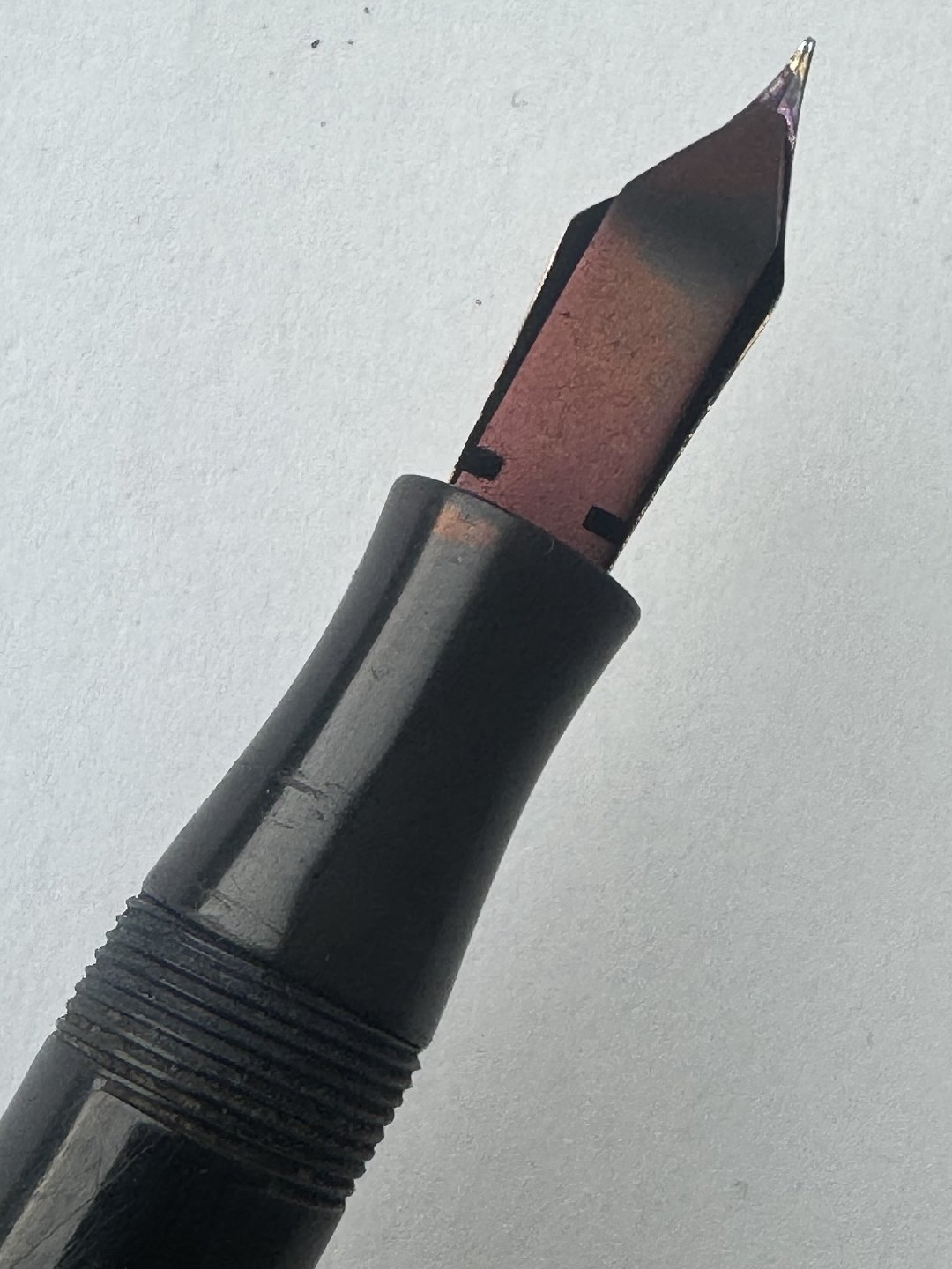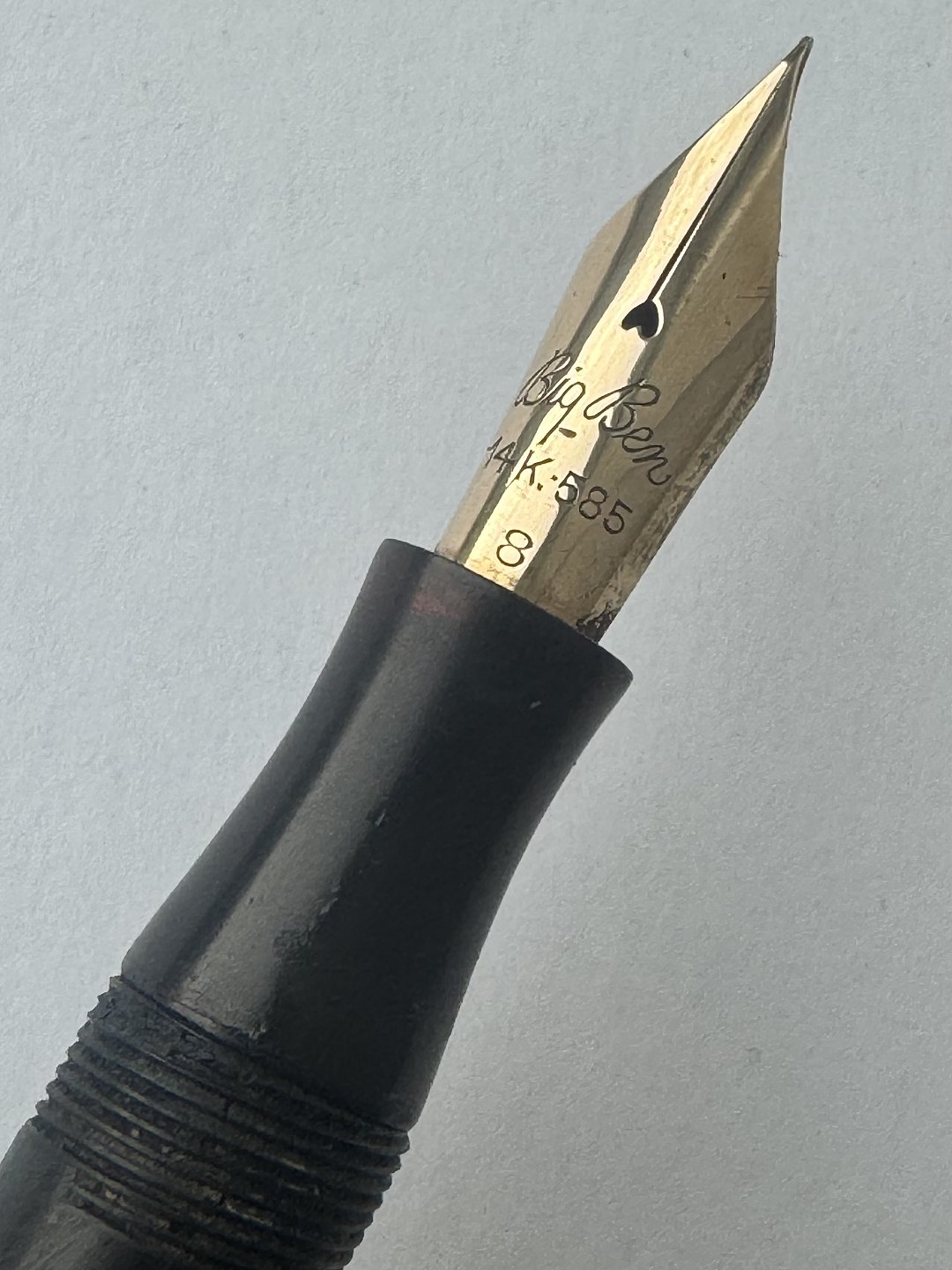 Stor sort Big Ben no. 8 fyldepen med push button filler. Fremstår i god stand uden skader eller reparationer. Alle dele originale BB dele inklusiv en kæmpe guldspids i 14 karat. Der skal indsættes ny gummisæk så pennen igen kan optage blæk og skrive igen. Fyldepennen måler 13,7 cm i længde og hættens åbningsdismeter er 1,3 cm.Ny gummisæk kan indsættes for et tillæg i prisen på kr. 200,-
