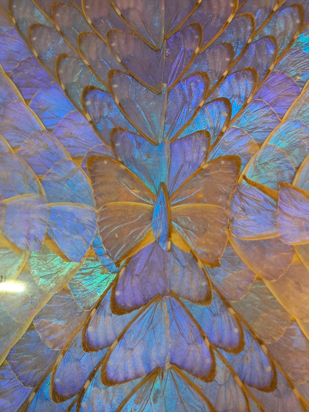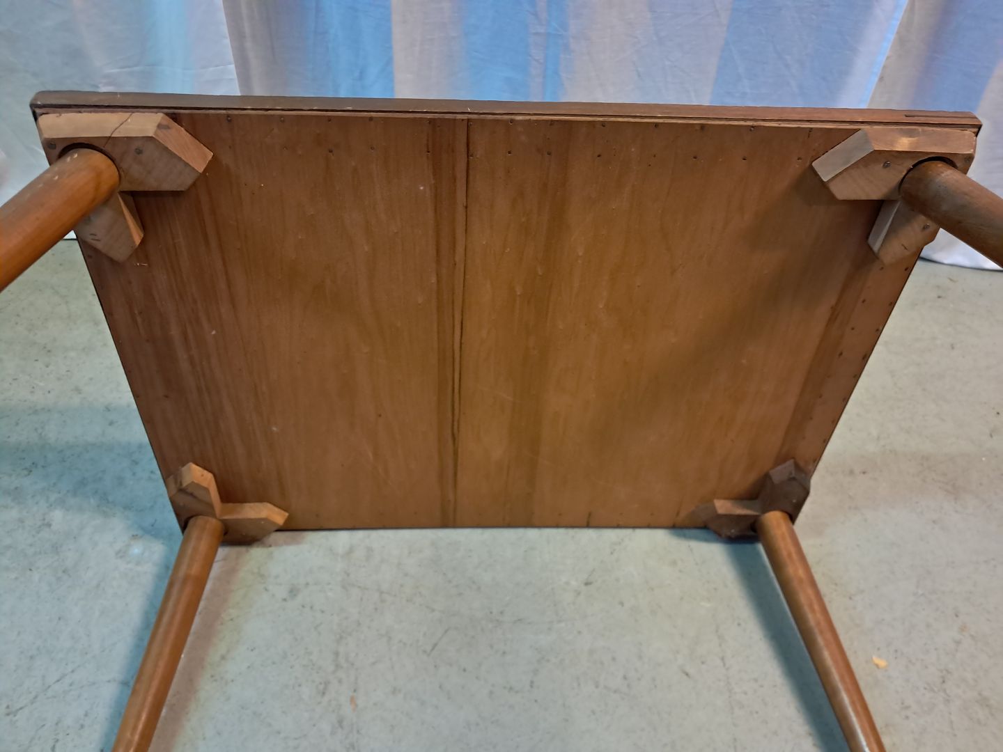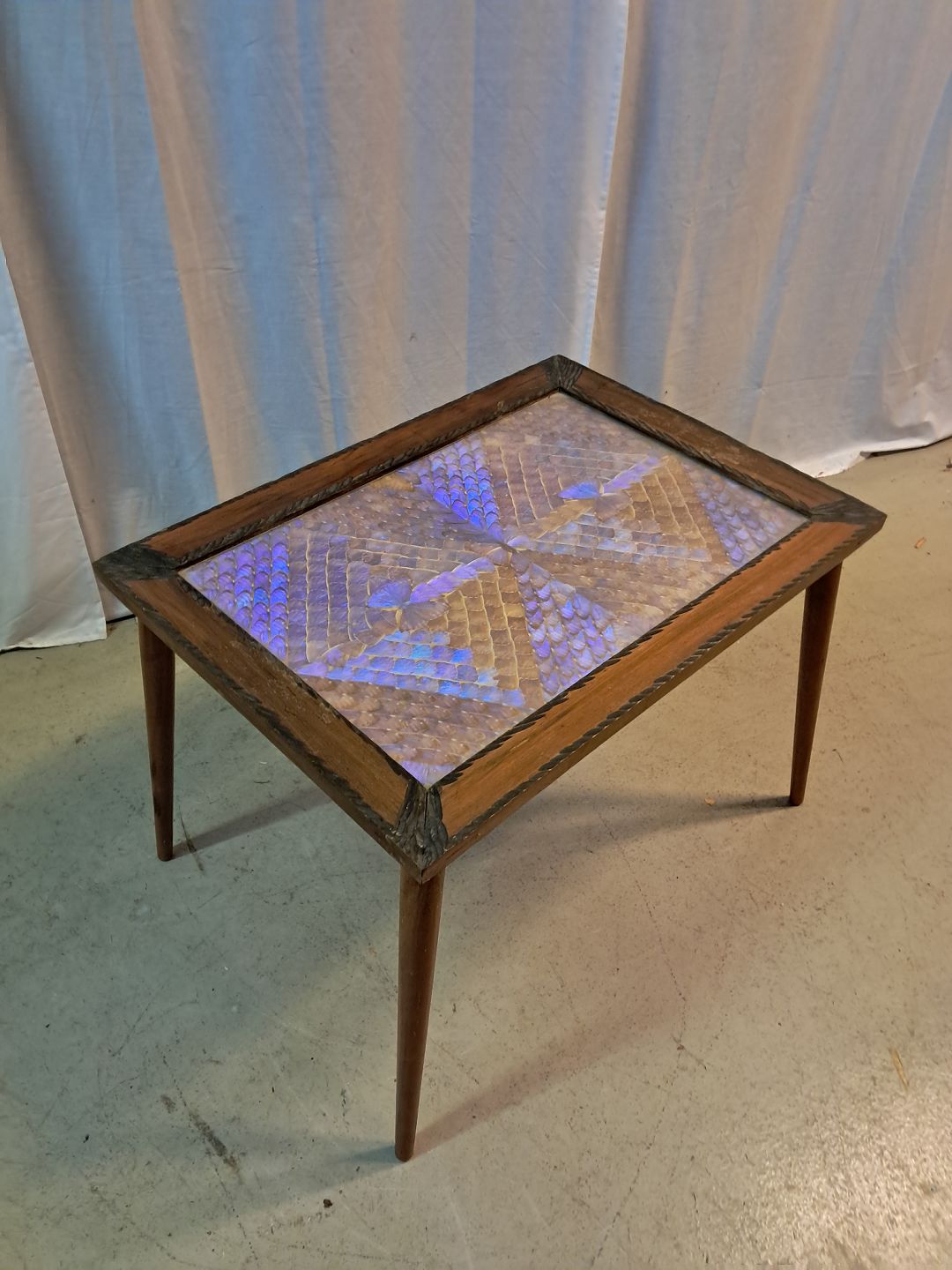 Sofabord i massivt bøgetræ med glasplade og sommerfuglevinger, fra 1980erne.Det har brugsspor.