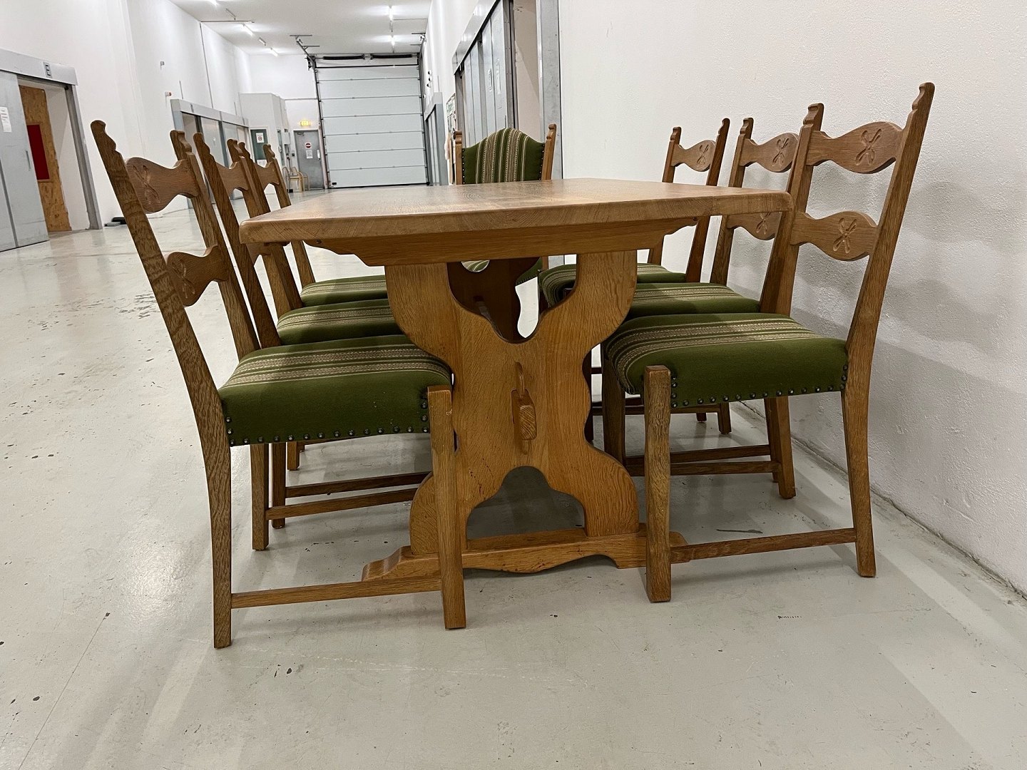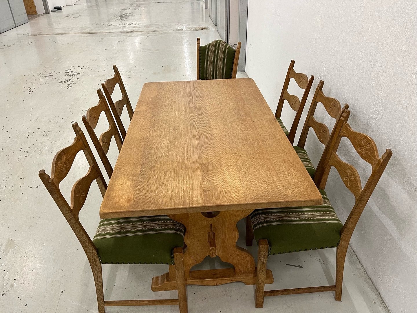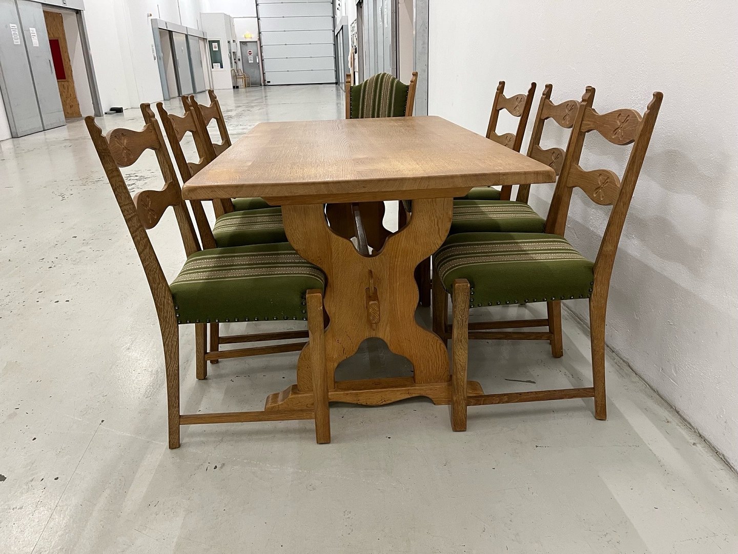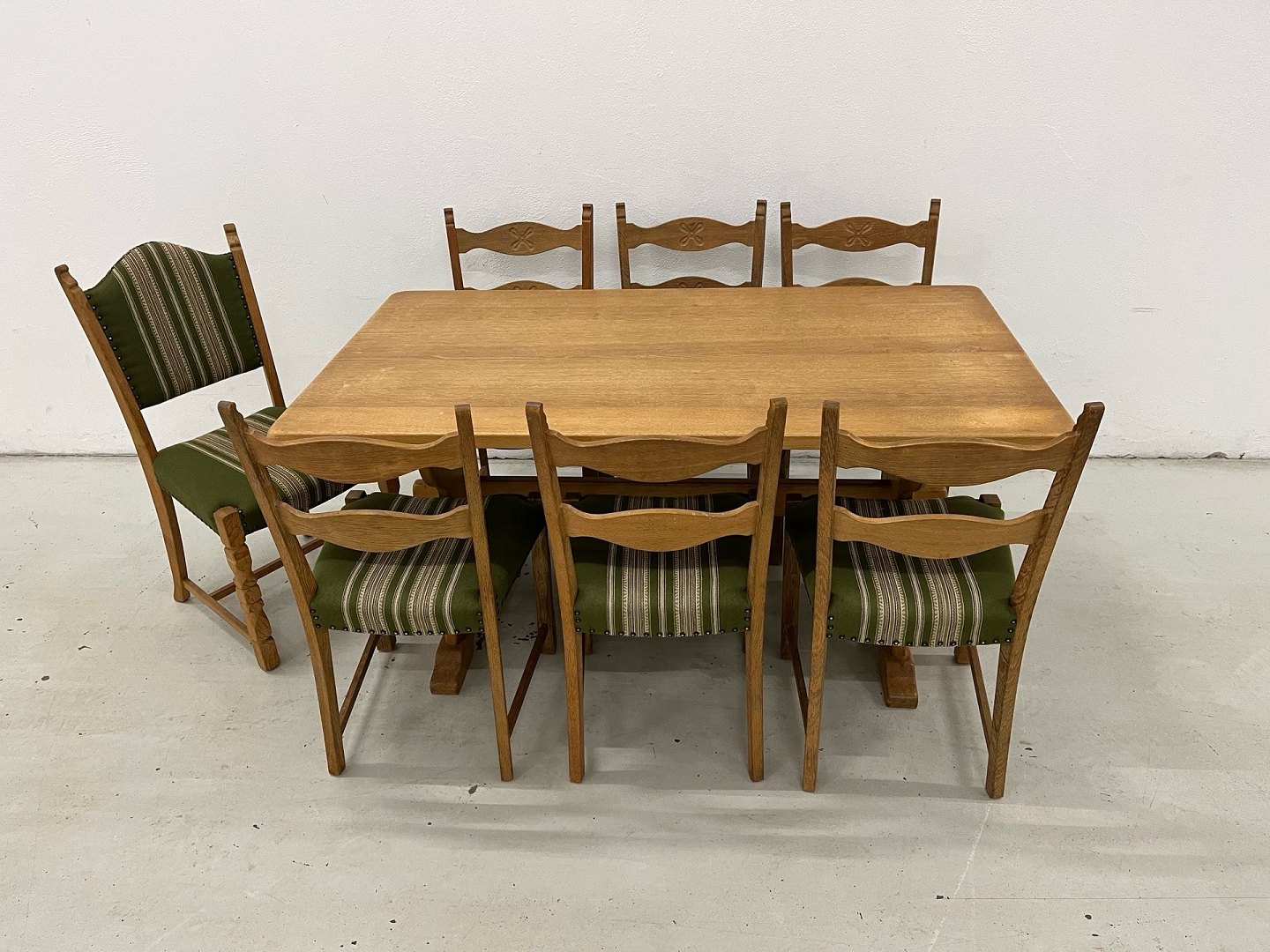 Klassisk spisebordssæt i massiv eg af Henry/Henning KjærnulfDette elegante spisebordssæt i massiv eg er designet af Henry/Henning Kjærnulf og fremstår som et smukt eksempel på dansk møbeldesign fra 1960’erne. Sættet har haft samme ejer siden 1967 og er bevaret i særdeles flot stand med kun få, naturlige brugsspor ingen dyr eller røg.