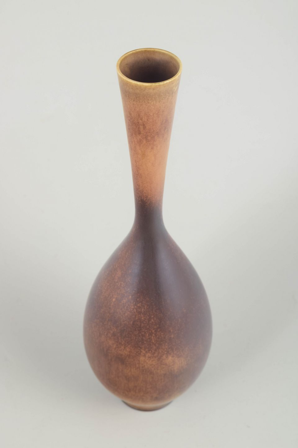 Elegant, slankhalset studio-drejet vase udført i stentøj med karakteristisk, fintharmoniseret glasur i varme brune og violette nuancer. Formen er balanceret og præcist proportioneret, med en blød overgang mellem den pæreformede krop og den lange, smalle hals – et klassisk eksempel på Berndt Fribergs modne arbejder fra Gustavsberg Studio.