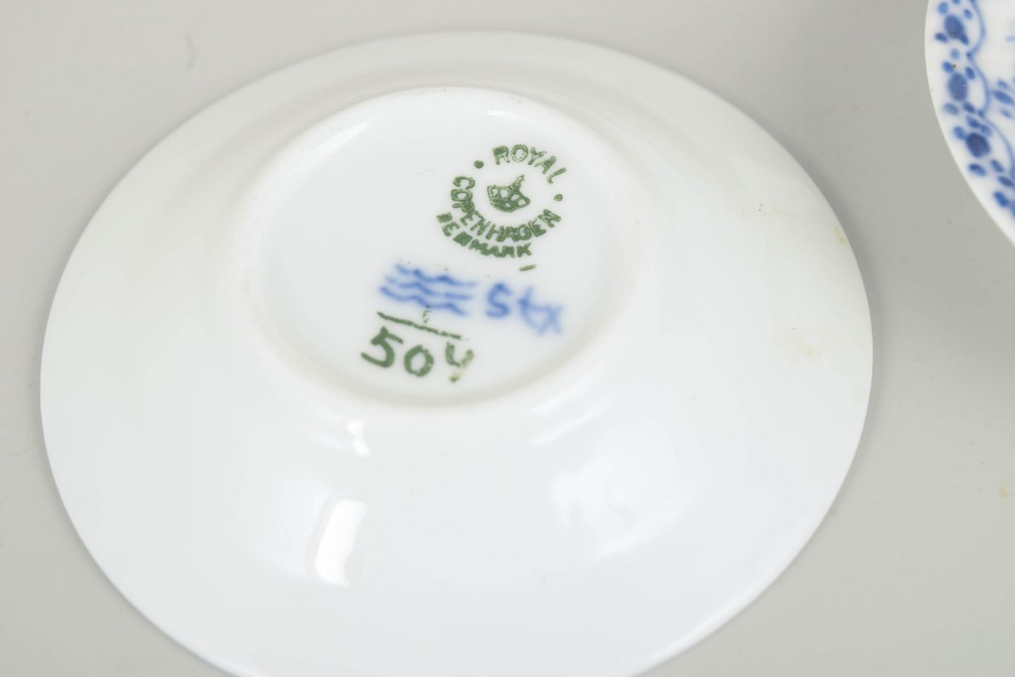 Sæt bestående af fire kaviarfade i Musselmalet halvblonde. Skålene er udført i riflede former med blondekant og håndmalet koboltblå dekoration. En tidlig og raffineret serveringsform, oprindeligt anvendt til kaviar og andre delikatesser.