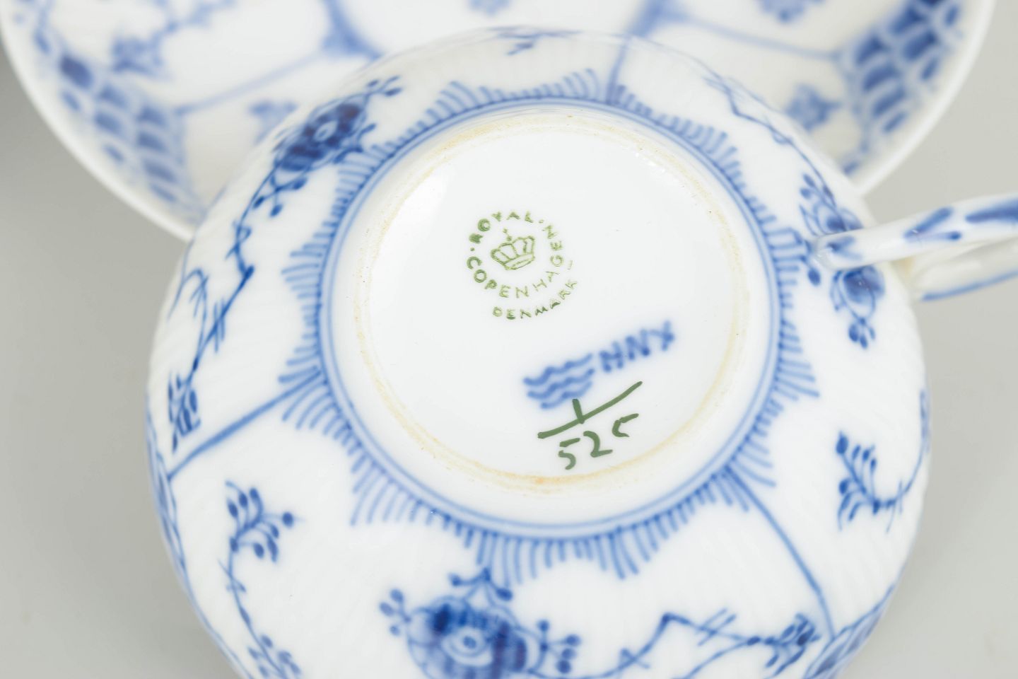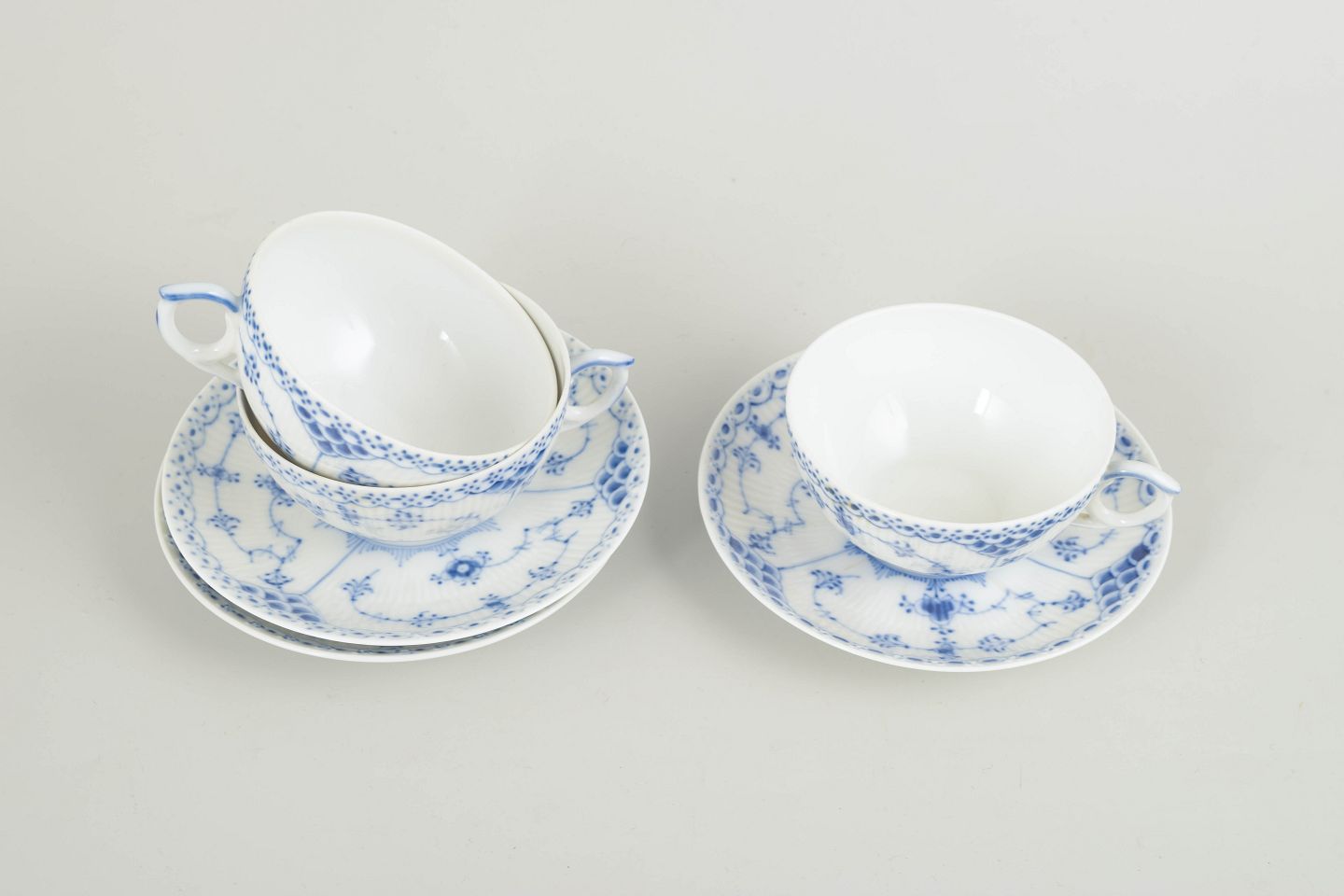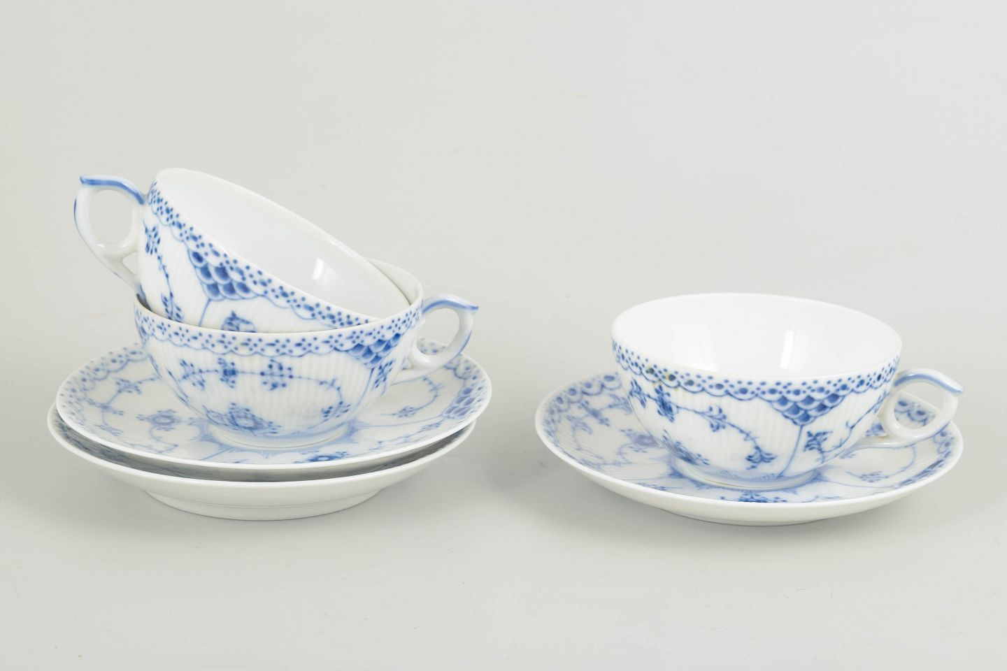 Royal CopenhagenBlue Fluted Half Lace teacups with saucers, set of 3, 1980s.