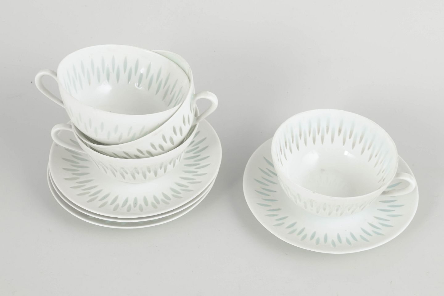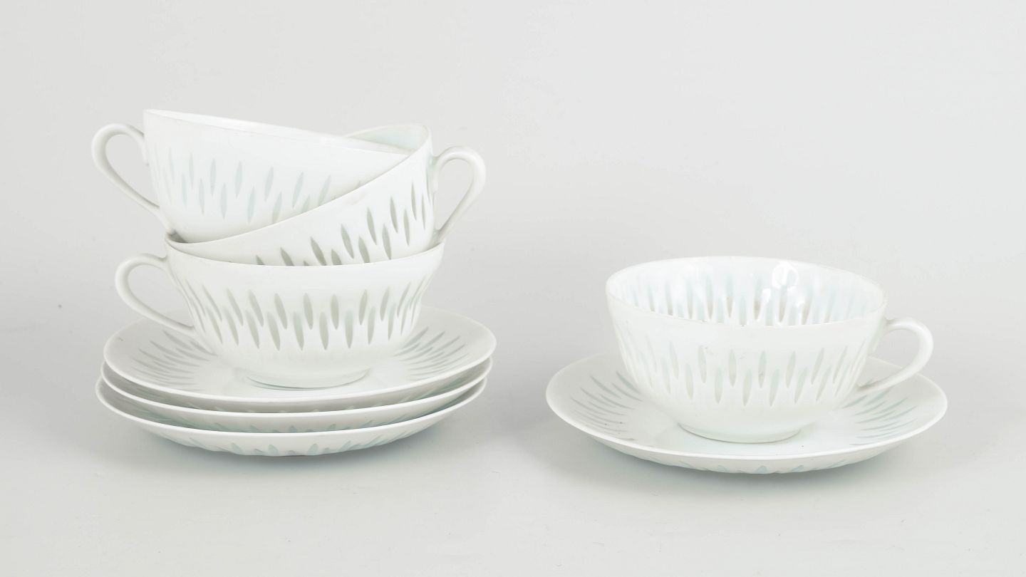 Sæt bestående af fire tekopper med tilhørende underkopper i hvidt porcelæn med gennembrudt “rice porcelain”-dekoration. De aflange perforeringer udfyldt med transparent glasur giver porcelænet et let og næsten translucent udtryk, mens de enkle, afrundede former er karakteristiske for Friedl Holzer-Kjellbergs sene modernistiske porcelænsdesign for Arabia.