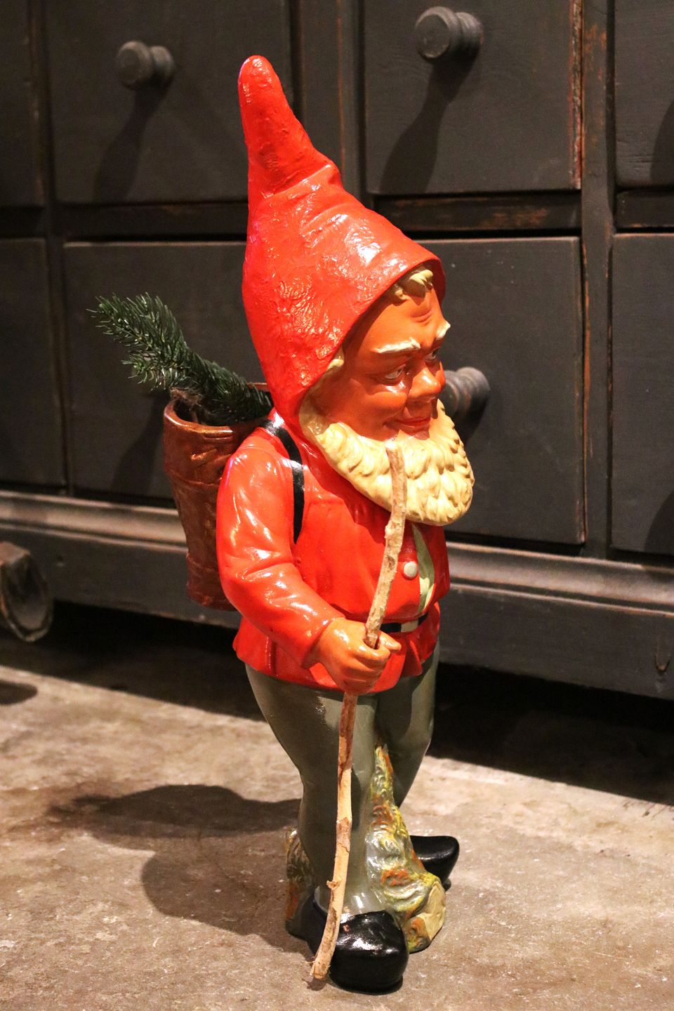 Stor terrakotta nisse fra 50érne med fin bemaling , rygsæk og stok i træ.Højde: 49,5cm.