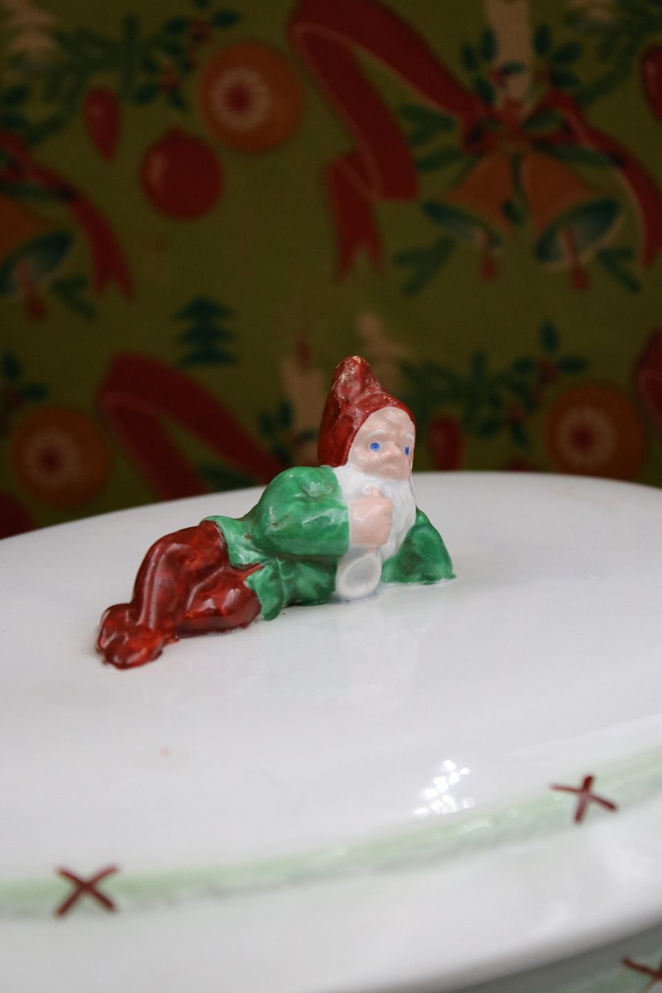 Antik , svensk oval herregårds jule terrin i fajance med farvelagt nisse liggende på toppen af låget og 2 nisse hoveder som hanke på siden.H: 14,5cm. L&B: 30,5x19cm.