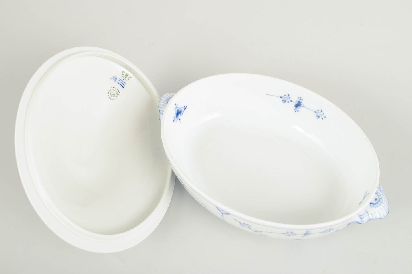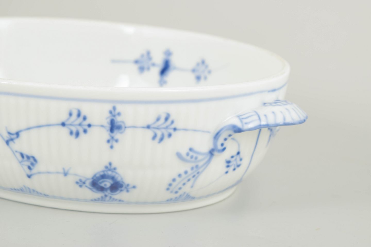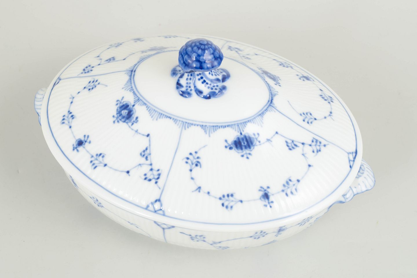 Royal Copenhagen Musselmalet Riflet oval terrin med låg, 1962.Klassisk oval terrin i Musselmalet Riflet med tilhørende låg og knopformet greb. Terrinen er udført i riflet form og dekoreret med håndmalet koboltblå underglasur i det traditionelle musselmalede mønster. En elegant og funktionel serveringsdel, velegnet til supper, grøntsager eller varme retter.